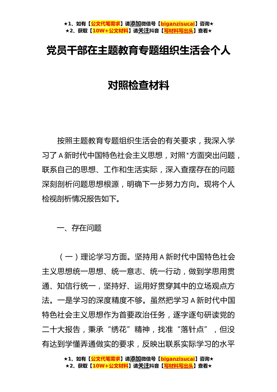 ★1、如有【公文代笔需求】请添加微信号【biganzisucai】咨询★★2、获取【10W+公文材料】请关注抖音【写材料写出头】查看★党员干部在主题教育专题组织生活会个人对照检查材料按照主题教育专题组织生活会的有关要求,我深入学习了A新时代中国特色社会主义思想,对照*方面突出问题,联系自己的思想、工作和生活实际,深入查摆存在的问题深刻剖析问题思想根源,明确下一步努力方向。现将个人检视剖析情况报告如下。一、存在问题(一)理论学习方面。坚持用A新时代中国特色社会主义思想统一思想、统一意志、统一行动,做到学思用贯通、知信行统一,坚持好、运用好贯穿其中的立场观点方法。一是学习的深度精度不够。虽然把学习A新时代中国特色社会主义思想作为首要政治任务,逐字逐句研读党的二十大报告,秉承“绣花...