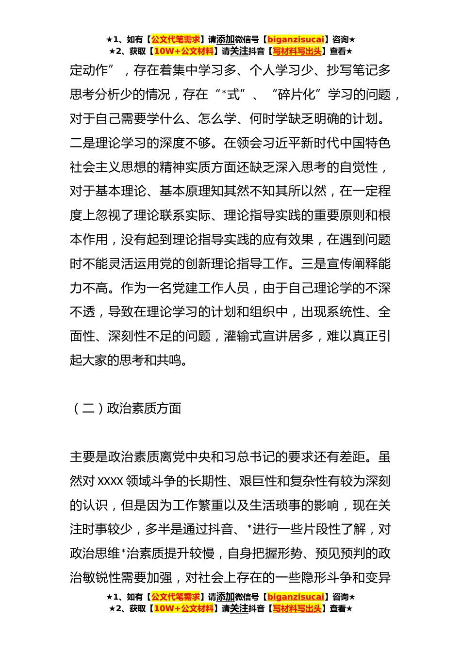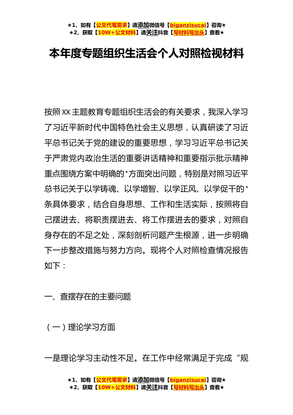 ★1、如有【公文代笔需求】请添加微信号【biganzisucai】咨询★★2、获取【10W+公文材料】请关注抖音【写材料写出头】查看★本年度专题组织生活会个人对照检视材料按照XX主题教育专题组织生活会的有关要求,我深入学习了习近平新时代中国特色社会主义思想,认真研读了习近平总书记关于党的建设的重要思想,学习习近平总书记关于严肃党内政治生活的重要讲话精神和重要指示批示精神重点围绕方案中明确的*方面突出问题,特别是对照习近平总书记关于以学铸魂、以学增智、以学正风、以学促干的*条具体要求,结合自身思想、工作和生活实际,按照将自己摆进去、将职责摆进去、将工作摆进去的要求,对照自身存在的不足之处,深刻剖析问题产生根源,进一步明确下一步整改措施与努力方向。现将个人对照检查情况报告如下:一...