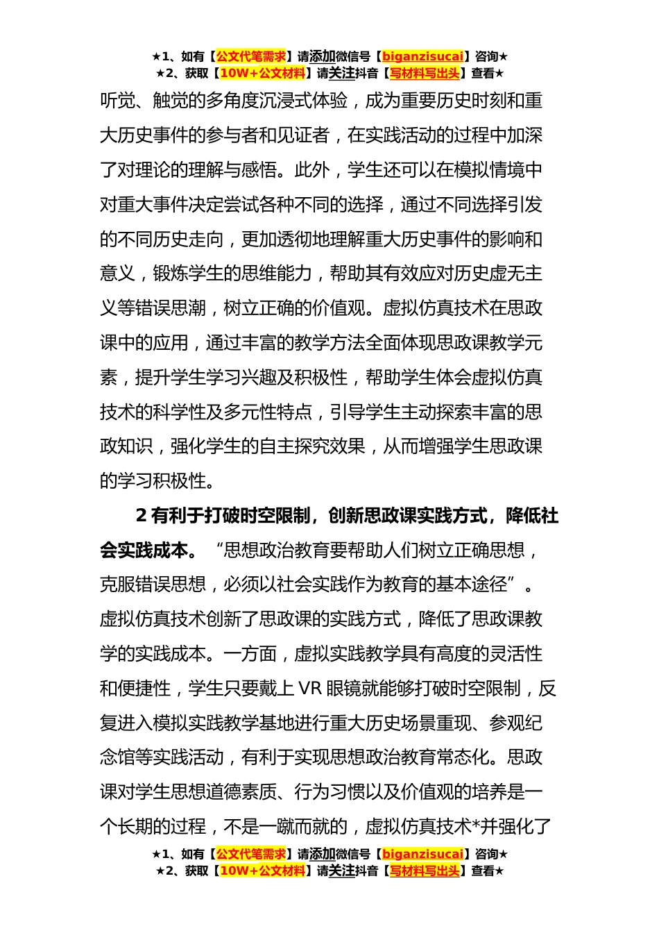 ★1、如有【公文代笔需求】请添加微信号【biganzisucai】咨询★★2、获取【10W+公文材料】请关注抖音【写材料写出头】查看★高校思政教师培训材料*习近平总书记在全国高校思想政治工作会议上强调:“要运用新媒体新技术使工作活起来,推动思想政治工作传统优势同信息技术高度融合,增强时代感和吸引力。”习近平总书记的讲话深刻揭示了信息化时代现代教学技术与思想政治理论课(以下简称“思政课”)教学结合的重要意义,高校要积极响应时代的要求和科技的进步,推动虚拟仿真技术在思政课中的应用,推进思政课的创新发展。一、虚拟仿真技术应用于思政课的突出优势虚拟仿真技术是指通过计算机构建出仿真的虚拟场景,将其应用于高校思政课教学中,有利于通过模拟实践激发学生的真实情感,强化学生的理论学习,弥补传...