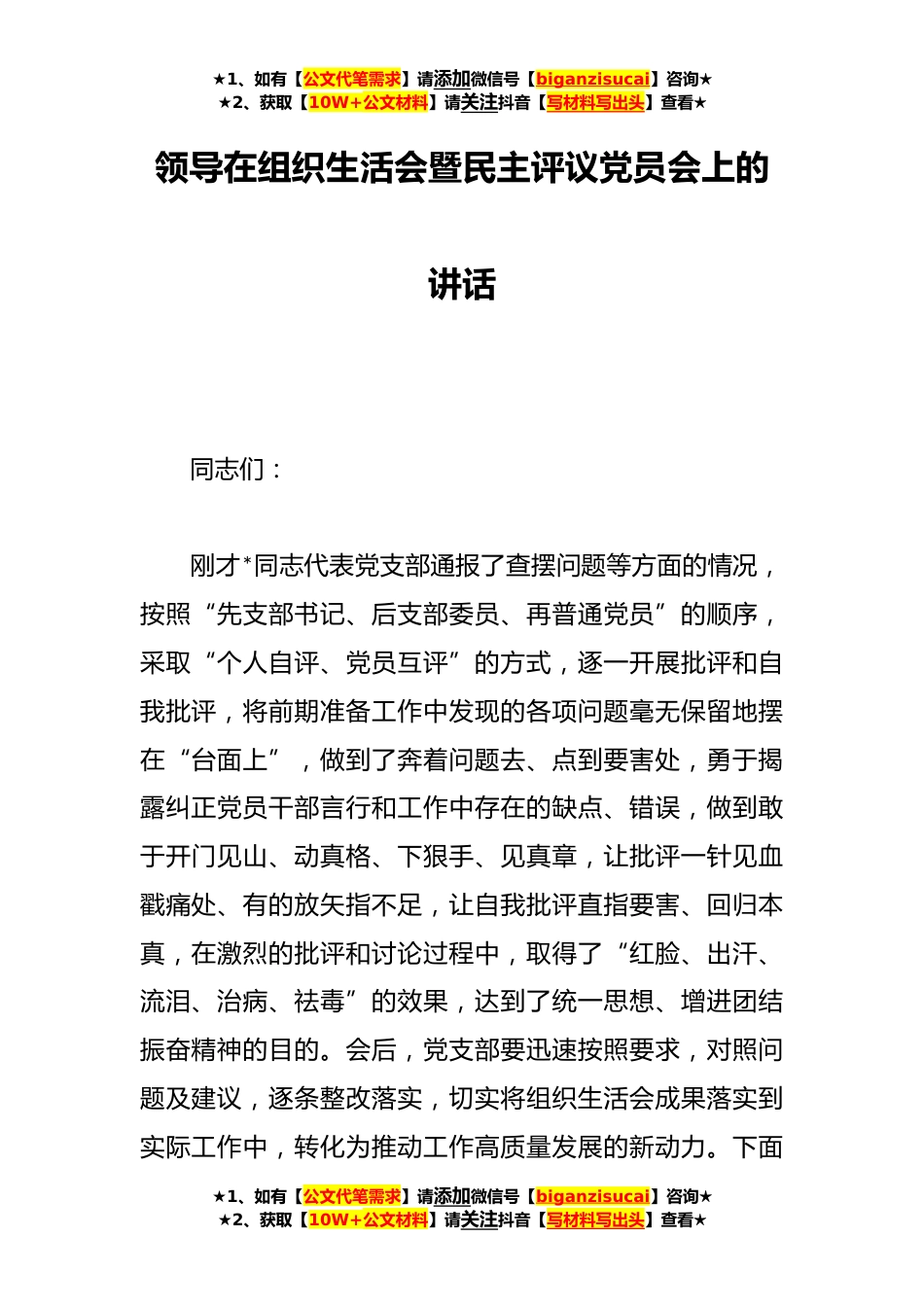 ★1、如有【公文代笔需求】请添加微信号【biganzisucai】咨询★★2、获取【10W+公文材料】请关注抖音【写材料写出头】查看★领导在组织生活会暨民主评议党员会上的讲话同志们:刚才*同志代表党支部通报了查摆问题等方面的情况,按照“先支部书记、后支部委员、再普通党员”的顺序,采取“个人自评、党员互评”的方式,逐一开展批评和自我批评,将前期准备工作中发现的各项问题毫无保留地摆在“台面上”,做到了奔着问题去、点到要害处,勇于揭露纠正党员干部言行和工作中存在的缺点、错误,做到敢于开门见山、动真格、下狠手、见真章,让批评一针见血戳痛处、有的放矢指不足,让自我批评直指要害、回归本真,在激烈的批评和讨论过程中,取得了“红脸、出汗、流泪、治病、祛毒”的效果,达到了统一思想、增进团结振...