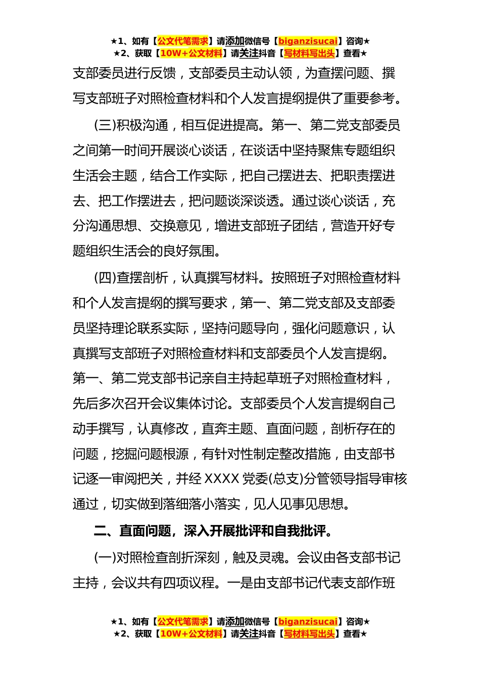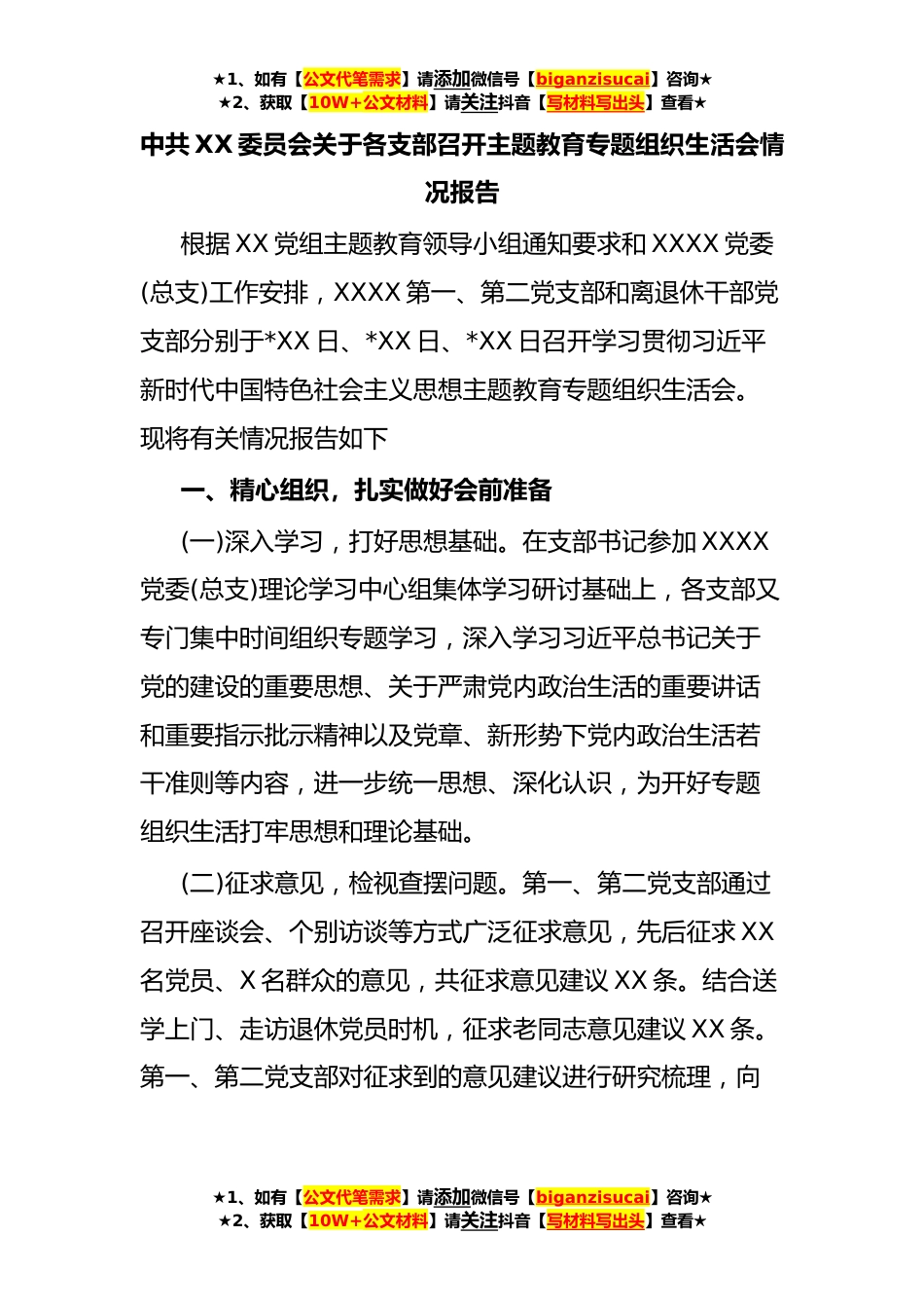 ★1、如有【公文代笔需求】请添加微信号【biganzisucai】咨询★★2、获取【10W+公文材料】请关注抖音【写材料写出头】查看★中共XX委员会关于各支部召开主题教育专题组织生活会情况报告根据XX党组主题教育领导小组通知要求和XXXX党委(总支)工作安排,XXXX第一、第二党支部和离退休干部党支部分别于*XX日、*XX日、*XX日召开学习贯彻习近平新时代中国特色社会主义思想主题教育专题组织生活会。现将有关情况报告如下一、精心组织,扎实做好会前准备(一)深入学习,打好思想基础。在支部书记参加XXXX党委(总支)理论学习中心组集体学习研讨基础上,各支部又专门集中时间组织专题学习,深入学习习近平总书记关于党的建设的重要思想、关于严肃党内政治生活的重要讲话和重要指示批示精神以及党章、新形势下党内政治生活若干...