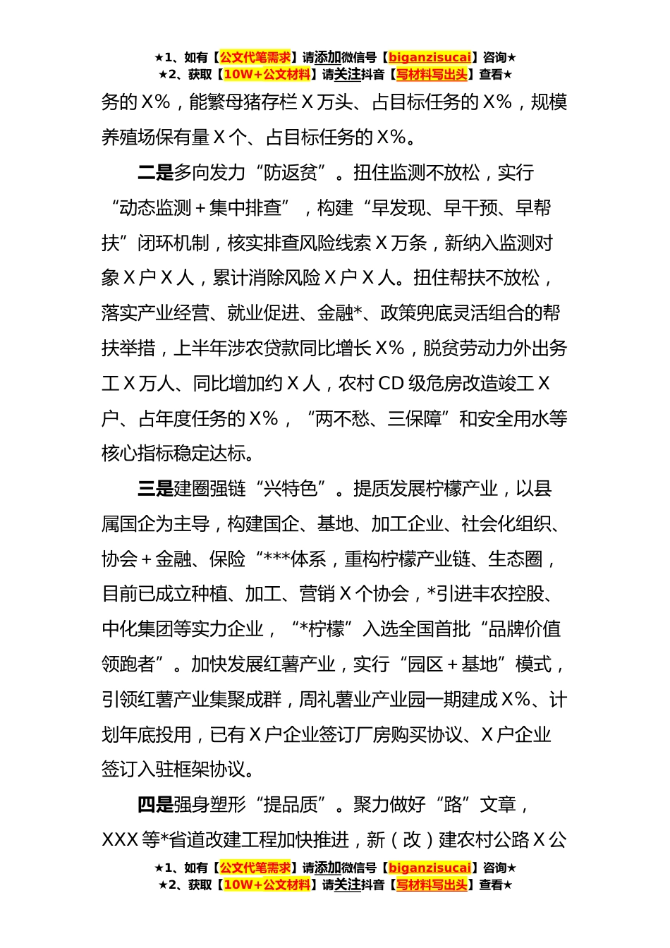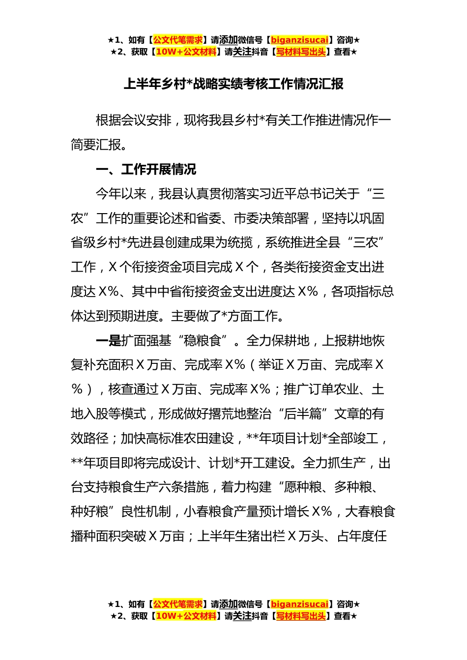 ★1、如有【公文代笔需求】请添加微信号【biganzisucai】咨询★★2、获取【10W+公文材料】请关注抖音【写材料写出头】查看★上半年乡村*战略实绩考核工作情况汇报根据会议安排,现将我县乡村*有关工作推进情况作一简要汇报。一、工作开展情况今年以来,我县认真贯彻落实习近平总书记关于“三农”工作的重要论述和省委、市委决策部署,坚持以巩固省级乡村*先进县创建成果为统揽,系统推进全县“三农”工作,X个衔接资金项目完成X个,各类衔接资金支出进度达X%、其中中省衔接资金支出进度达X%,各项指标总体达到预期进度。主要做了*方面工作。一是扩面强基“稳粮食”。全力保耕地,上报耕地恢复补充面积X万亩、完成率X%(举证X万亩、完成率X%),核查通过X万亩、完成率X%;推广订单农业、土地入股等模式,形成...