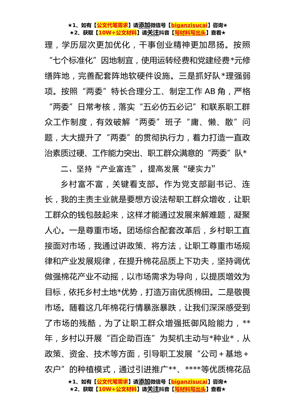 ★1、如有【公文代笔需求】请添加微信号【biganzisucai】咨询★★2、获取【10W+公文材料】请关注抖音【写材料写出头】查看★汇报发言:激活乡村经济“动力源”助力乡村*“加速跑”(**字)尊敬的各位领导、各位评委:大家好!我是XX党支部副书记XX,我今天汇报的题目是《激活乡村经济“源动力”助力乡村*“加速跑”》。XX位于XX以西*公里,土地面积***,职工**,“两委”*,后备“两委”*,党员*人。近年来,XX在XX党委的正确领导下,以乡村*为抓手,按照“因地制宜、科学规划、多元发展、持续壮大”的思路,立足乡村*禀赋,突出“民”字宗旨,积极探索乡村产业发展新路子,拓宽职工致富新渠道,大力推进“龙头企业+*社+职工”的农业发展新模式,形成了党支部推动、党员、职工代表带动、*社拉动、职工群众联动的...
