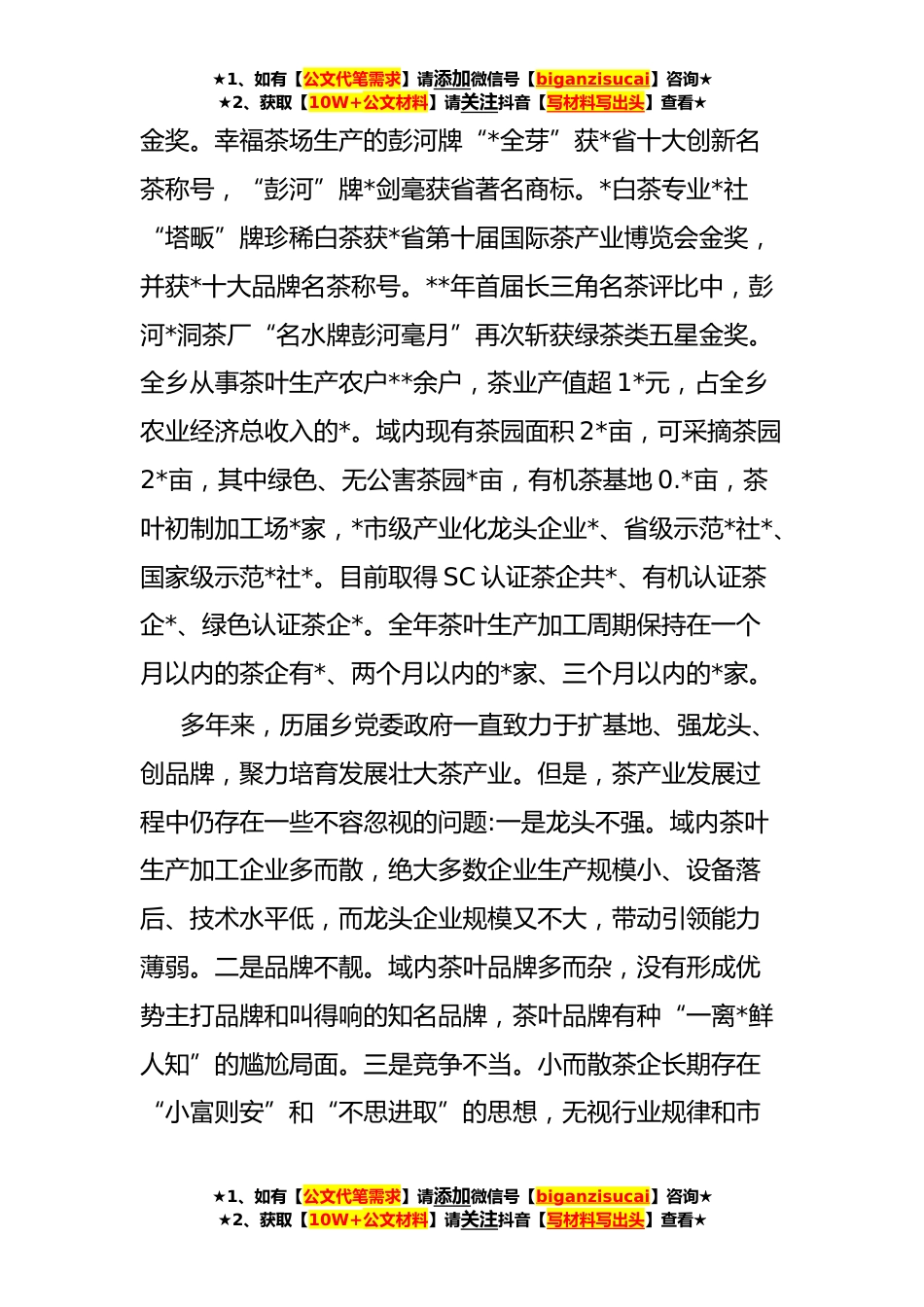 ★1、如有【公文代笔需求】请添加微信号【biganzisucai】咨询★★2、获取【10W+公文材料】请关注抖音【写材料写出头】查看★xx乡推动茶产业发展壮大工作实施方案为深入贯彻落实党的XX大精神和习近平总书记关于茶产业发展的重要讲话和指示批示精神,坚决做好省委巡视组反馈“龙头企业规模小、带动能力弱,知名农产品品牌少,小茶厂无序竞争”问题整改的后半篇文章,根据市委市政府“农业兴农”工作部署,结合我乡茶产业发展实际,现就推深做实我乡茶产业发展壮大提出如下方案。一、总体思路坚持以习近平新时代中国特色社会主义思想为指导,立足新发展阶段,全面准确贯彻新发展理念,紧密结合塔畈乡茶产业发展实际,精准分析研判茶产业发展过程中的短板问题,厘清思路,整合优势*,大力引导“政府搭台、企业唱戏”推...
