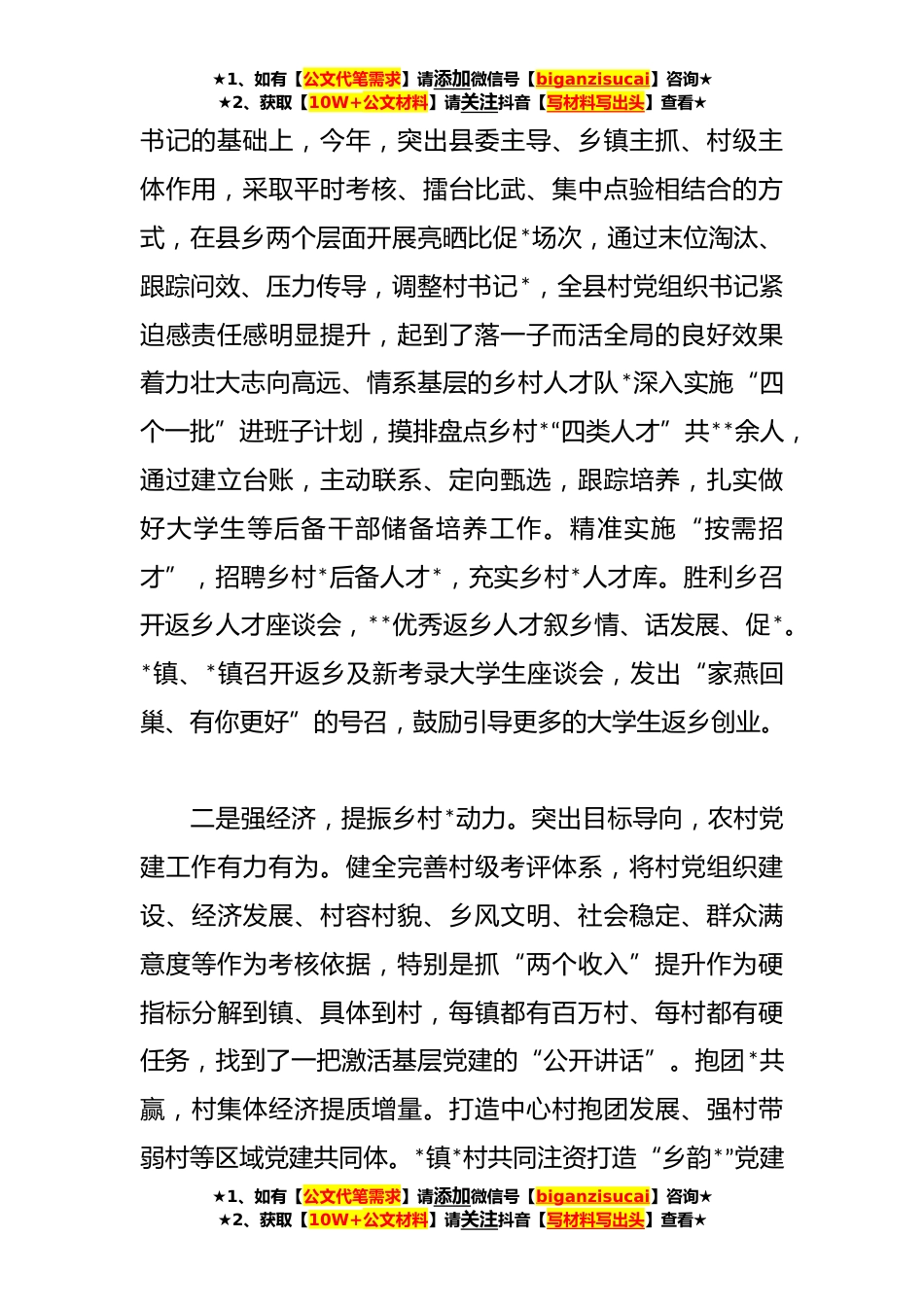 ★1、如有【公文代笔需求】请添加微信号【biganzisucai】咨询★★2、获取【10W+公文材料】请关注抖音【写材料写出头】查看★经验材料:抓“三强”提“三力”推动党建引领乡村全面*近年来,*县认真贯彻乡村*战略重大决策部署,坚持抓党建促乡村*、以党建红引领发展红,在区市党委组织部的精心指导下,抓“三强”提“三力”,持续增强农村基层党组织政治功能和组织功能,助推乡村*提效提速。一是强头雁,提升示范带动能力。着力锻造本领高强善谋善成的镇村干部队*县委结合届中分析、干部“红黄榜”,调整乡镇党委班子成员*人,部机关领导干部“一对一”包联乡镇定期指导。探索实施年轻干部“双向挂职”选派*名县直部门和乡镇专业干部“双向奔赴”锻炼储备。组织全县镇村干部*批次*余人前往*、*、*等区内外学习乡村治...