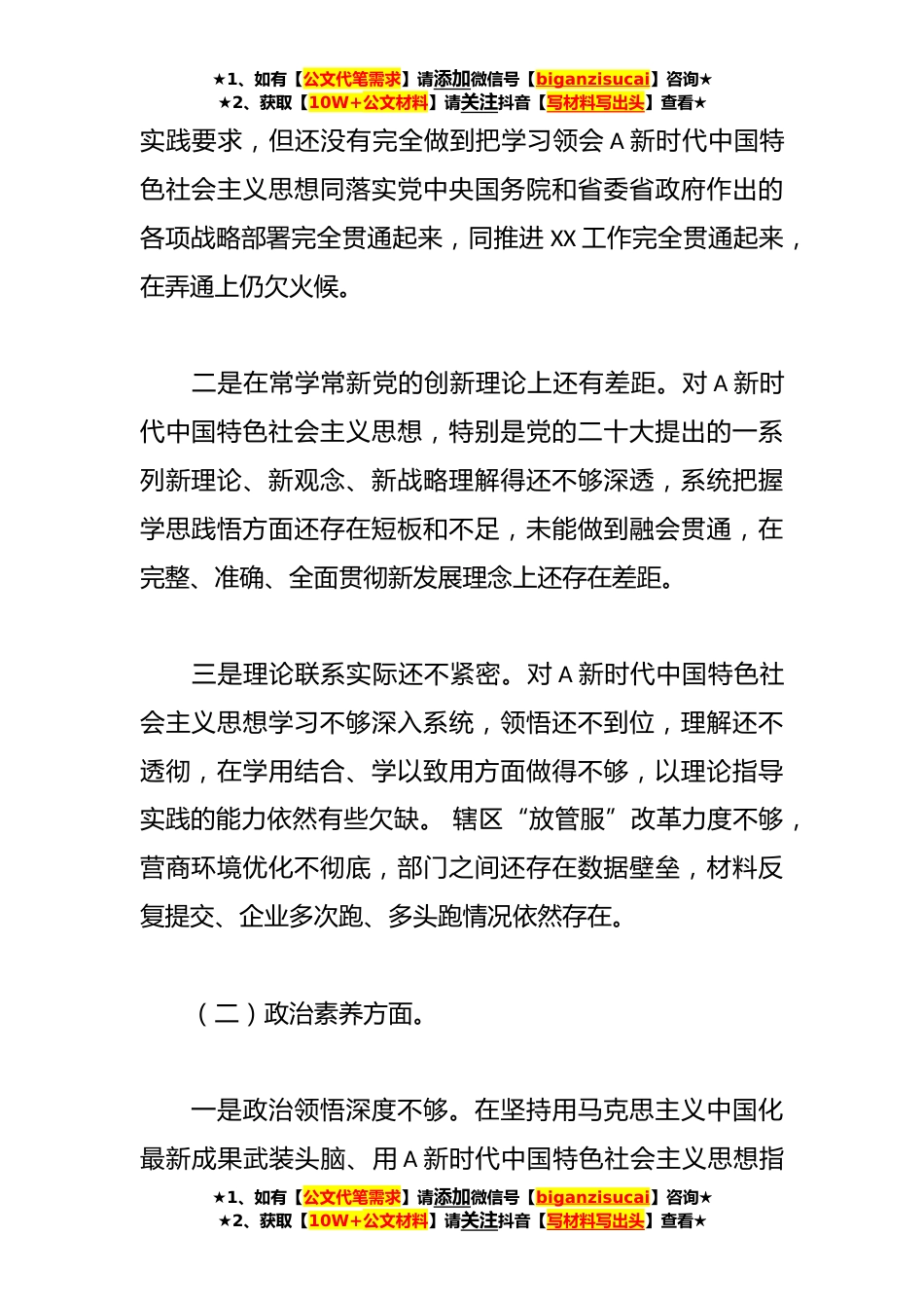 ★1、如有【公文代笔需求】请添加微信号【biganzisucai】咨询★★2、获取【10W+公文材料】请关注抖音【写材料写出头】查看★有关主题教育组织生活会个人对照检查剖析材料根据主题教育专题组织生活会实施方案的要求,本人紧紧围绕会议主题,聚焦学思想、强党性、重实践、建新功总要求,深入学习领悟以学铸魂、以学增智、以学正风以学促干的丰富内涵和实践要求,对照六个方面,认真检视存在的问题、深刻剖析,明确了整改措施。现做对照检查如下:一、存在问题(一)理论学习方面。一是在学懂、弄通A新时代中国特色社会主义思想上还存在距离。虽然能够常态化制度化学习A新时代中国特色社会主义思想,深刻认识到A新时代中国特色社会主义思想的时代意义、理论意义、实践意义、世界意义,深刻理解到这一伟大思想的核心要...