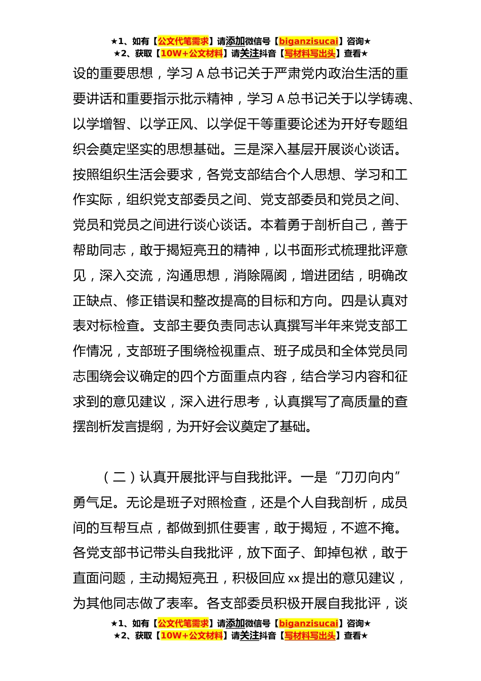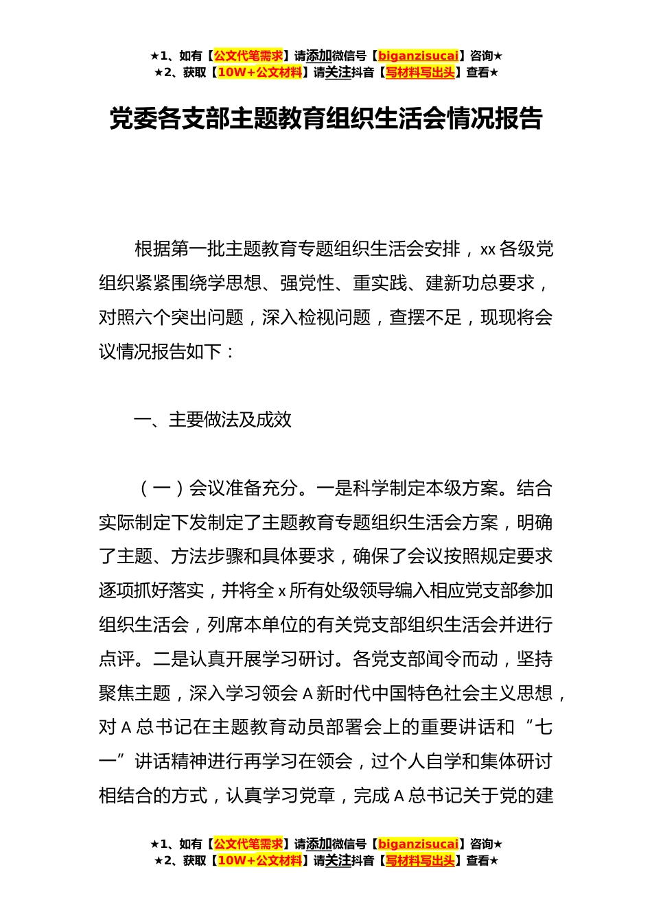 ★1、如有【公文代笔需求】请添加微信号【biganzisucai】咨询★★2、获取【10W+公文材料】请关注抖音【写材料写出头】查看★党委各支部主题教育组织生活会情况报告根据第一批主题教育专题组织生活会安排,xx各级党组织紧紧围绕学思想、强党性、重实践、建新功总要求,对照六个突出问题,深入检视问题,查摆不足,现现将会议情况报告如下:一、主要做法及成效(一)会议准备充分。一是科学制定本级方案。结合实际制定下发制定了主题教育专题组织生活会方案,明确了主题、方法步骤和具体要求,确保了会议按照规定要求逐项抓好落实,并将全x所有处级领导编入相应党支部参加组织生活会,列席本单位的有关党支部组织生活会并进行点评。二是认真开展学习研讨。各党支部闻令而动,坚持聚焦主题,深入学习领会A新时代中国...