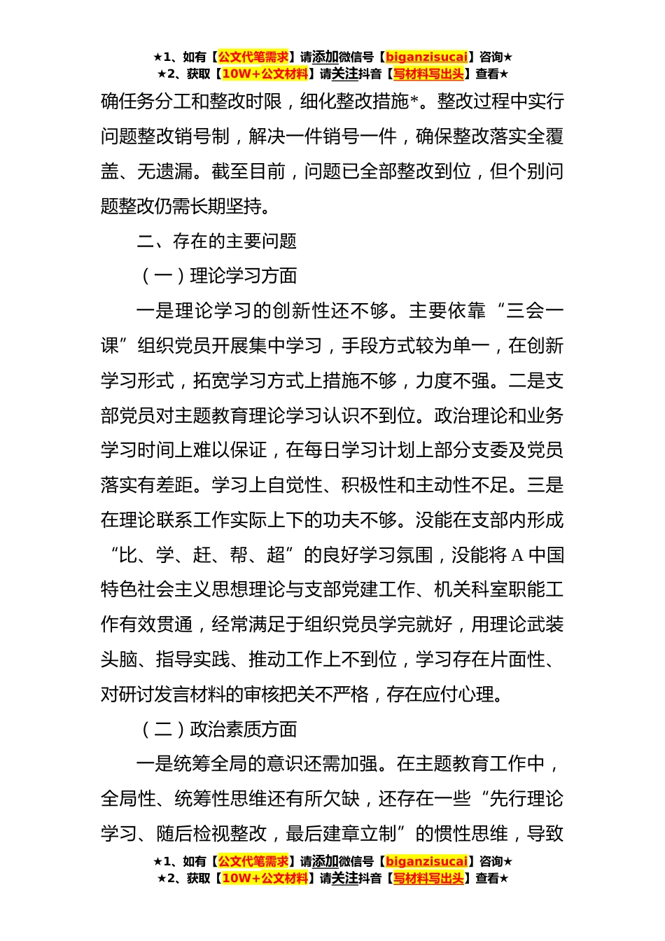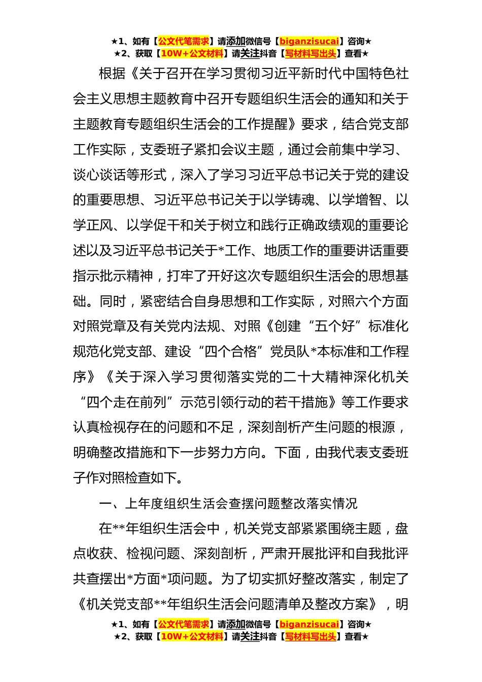 ★1、如有【公文代笔需求】请添加微信号【biganzisucai】咨询★★2、获取【10W+公文材料】请关注抖音【写材料写出头】查看★根据《关于召开在学习贯彻习近平新时代中国特色社会主义思想主题教育中召开专题组织生活会的通知和关于主题教育专题组织生活会的工作提醒》要求,结合党支部工作实际,支委班子紧扣会议主题,通过会前集中学习、谈心谈话等形式,深入了学习习近平总书记关于党的建设的重要思想、习近平总书记关于以学铸魂、以学增智、以学正风、以学促干和关于树立和践行正确政绩观的重要论述以及习近平总书记关于*工作、地质工作的重要讲话重要指示批示精神,打牢了开好这次专题组织生活会的思想基础。同时,紧密结合自身思想和工作实际,对照六个方面对照党章及有关党内法规、对照《创建“五个好”标准化...