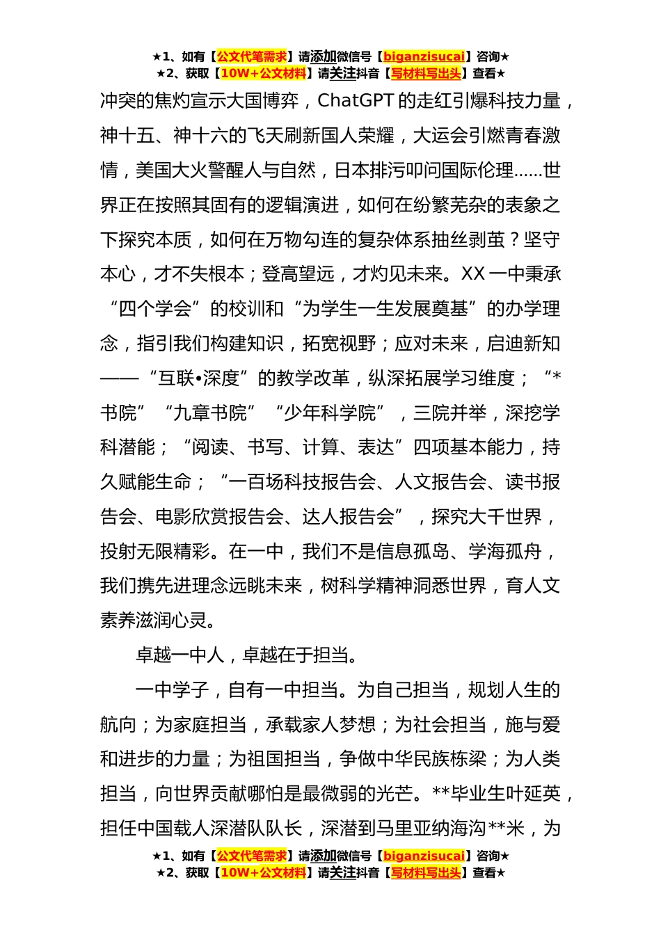 ★1、如有【公文代笔需求】请添加微信号【biganzisucai】咨询★★2、获取【10W+公文材料】请关注抖音【写材料写出头】查看★在XX区第一中学**学年第一学期开学典礼上的讲话亲爱的老师们、同学们:大家早上好!未觉池塘春草梦,阶前梧叶已秋声。暑气消退,清风渐起,值此新学期开学之际,我谨代表学校,向回到工作学习岗位的**多名一中师生致以热烈欢迎和亲切的问候!一中是一幅太美的画,每一次下笔都行云流水。这个暑假,校园建设、修缮如期推进;部分同学远赴德国交流、奔向*取经;女排从省赛赛场第十一次传来冠军捷报。一中是一幅太美的画,画中有你也有我。回望上一学年,学校高质量发展再上新台阶:学校荣获*市普通高中教学质量综合评价优秀奖,由*清北生和*博士生领衔的*名优秀青年教师加盟学校,新教学楼“...
