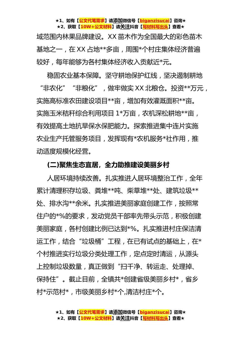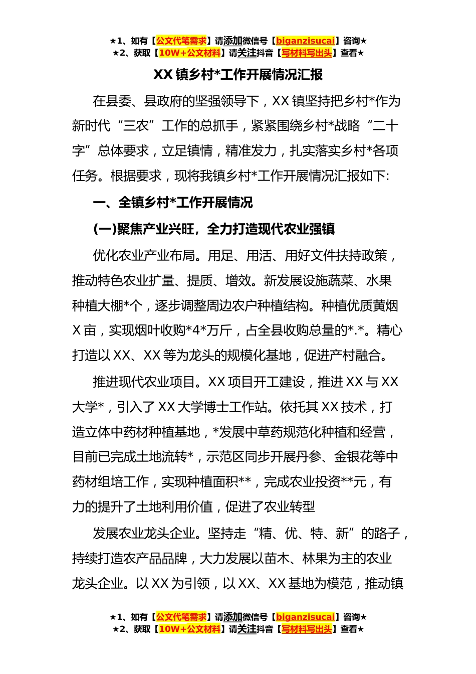 ★1、如有【公文代笔需求】请添加微信号【biganzisucai】咨询★★2、获取【10W+公文材料】请关注抖音【写材料写出头】查看★XX镇乡村*工作开展情况汇报在县委、县政府的坚强领导下,XX镇坚持把乡村*作为新时代“三农”工作的总抓手,紧紧围绕乡村*战略“二十字”总体要求,立足镇情,精准发力,扎实落实乡村*各项任务。根据要求,现将我镇乡村*工作开展情况汇报如下:一、全镇乡村*工作开展情况(一)聚焦产业兴旺,全力打造现代农业强镇优化农业产业布局。用足、用活、用好文件扶持政策,推动特色农业扩量、提质、增效。新发展设施蔬菜、水果种植大棚*个,逐步调整周边农户种植结构。种植优质黄烟X亩,实现烟叶收购*4*万斤,占全县收购总量的*.*。精心打造以XX、XX等为龙头的规模化基地,促进产村融合。推进现代农业...