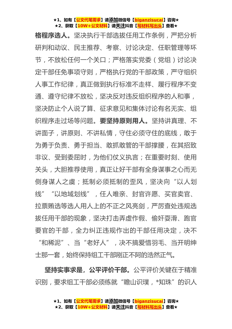 ★1、如有【公文代笔需求】请添加微信号【biganzisucai】咨询★★2、获取【10W+公文材料】请关注抖音【写材料写出头】查看★组织部长在市委理论学习中心组专题学习研讨交流会上发言同志们:在全省组织工作会议上,会议鲜明提出“组工干部要做公道正派、涵养正气的模范,公道对待干部、公平评价干部、公正使用干部。”组工干部要充分认识到,落实“三公”要求,是选人用人公信力之源,也是组工干部职业修养之基,必须将其作为组织工作的生命线抓紧抓实。根据研讨交流主题,结合全市组织工作实际,我谈几点体会。坚持作风正派,公道对待干部。公道正派是组工干部最大的德,是组工干部必须恪守的政治品格和职业操守。要求组工干部必须加强党的创新理论学习,尤其是学深悟透习近平新时代中国特色社会主义思想,不断涵...