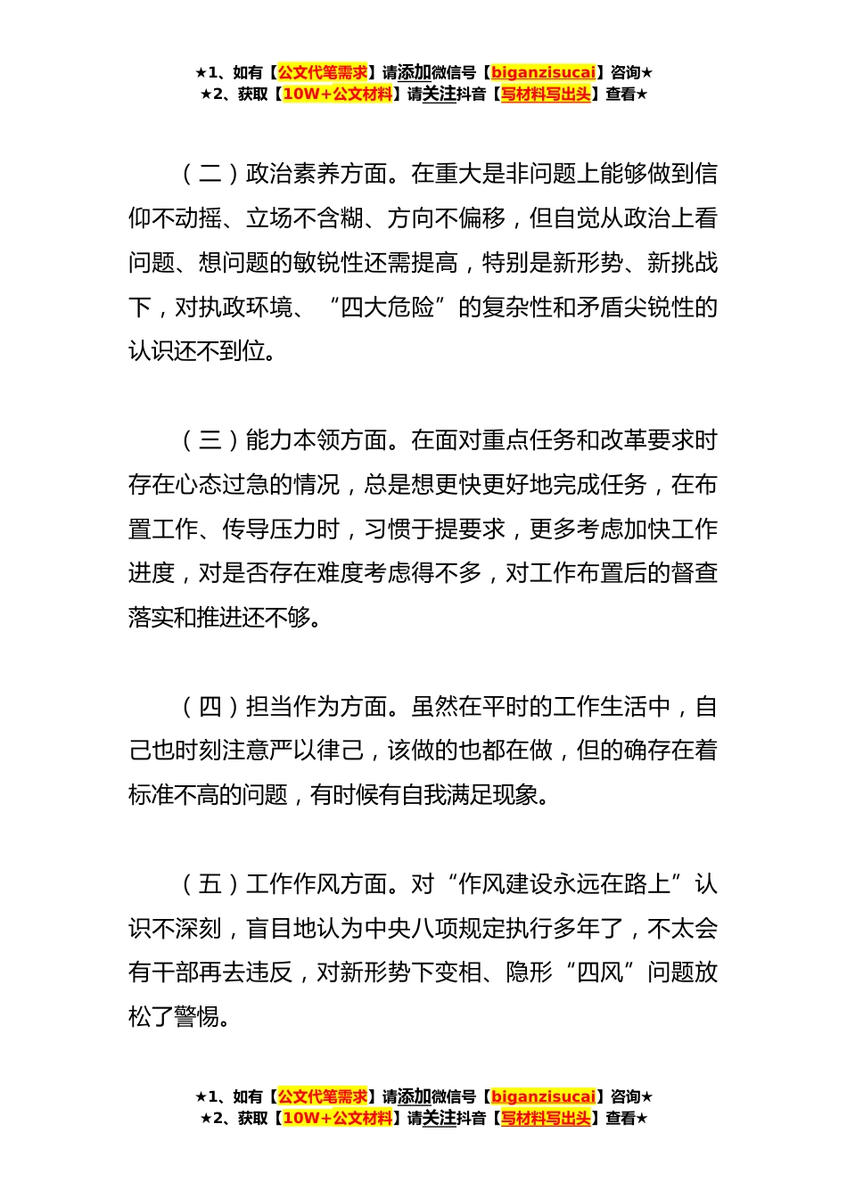 ★1、如有【公文代笔需求】请添加微信号【biganzisucai】咨询★★2、获取【10W+公文材料】请关注抖音【写材料写出头】查看★某党支部书记主题教育专题组织生活会个人剖析材料根据《××××通知》要求,本人紧扣会议主题,扎实做好会前准备工作,经认真对照六个方面,联系个人思想、学习和工作实际,深刻查摆自身存在的差距和不足,深刻剖析思想根源,明确了整改方向。现做对照检查如下:一、存在问题(一)理论学习方面。虽然能够自觉学习A新时代中国特色社会主义思想,牢固树立“四个意识”,坚定“四个自信”,做到“四个服从”,自觉在思想上政治上行动上同以A同志为核心的党中央保持高度一致,但是还需在学懂、弄通、做实上下功夫。主要表现为,学习缺乏连续性、系统性、全面性,有时忙于事务性工作,对理论...