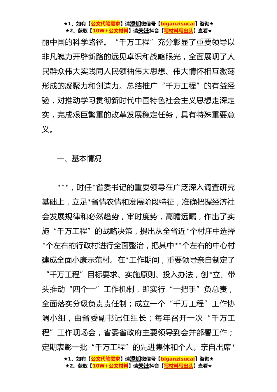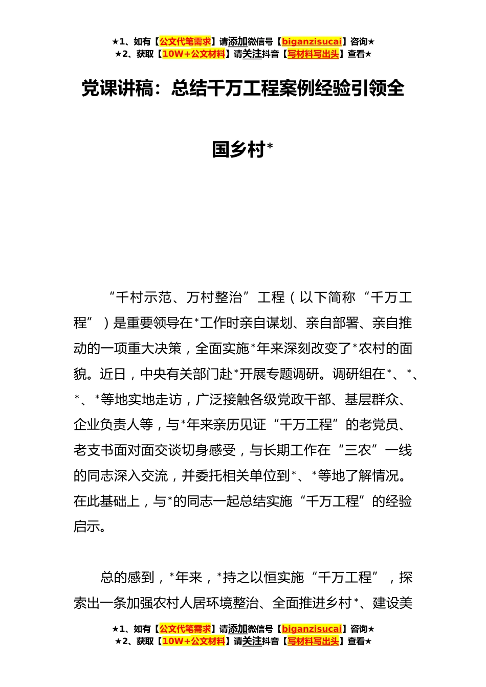 ★1、如有【公文代笔需求】请添加微信号【biganzisucai】咨询★★2、获取【10W+公文材料】请关注抖音【写材料写出头】查看★党课讲稿:总结千万工程案例经验引领全国乡村*“千村示范、万村整治”工程(以下简称“千万工程”)是重要领导在*工作时亲自谋划、亲自部署、亲自推动的一项重大决策,全面实施*年来深刻改变了*农村的面貌。近日,中央有关部门赴*开展专题调研。调研组在*、*、*、*等地实地走访,广泛接触各级党政干部、基层群众、企业负责人等,与*年来亲历见证“千万工程”的老党员、老支书面对面交谈切身感受,与长期工作在“三农”一线的同志深入交流,并委托相关单位到*、*等地了解情况。在此基础上,与*的同志一起总结实施“千万工程”的经验启示。总的感到,*年来,*持之以恒实施“千万工程”,探索...