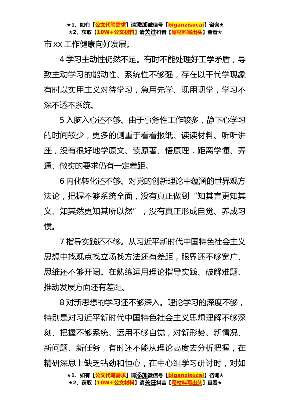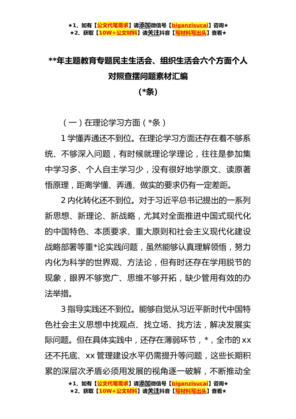 ★1、如有【公文代笔需求】请添加微信号【biganzisucai】咨询★★2、获取【10W+公文材料】请关注抖音【写材料写出头】查看★**年主题教育专题民主生活会、组织生活会六个方面个人对照查摆问题素材汇编(*条)(一)在理论学习方面(*条)1学懂弄通还不到位。在理论学习方面还存在着不够系统、不够深入问题,有时候就理论学理论,往往是参加集中学习多、个人自主学习少,没有很好地学原文、读原著悟原理,距离学懂、弄通、做实的要求仍有一定差距。2内化转化还不到位。对于习近平总书记提出的一系列新思想、新理论、新战略,尤其对全面推进中国式现代化的中国特色、本质要求、重大原则和社会主义现代化建设战略部署等重*论实践问题,虽然能够认真理解领悟,努力内化为科学的世界观、方法论,但有时还存在学用脱节的...