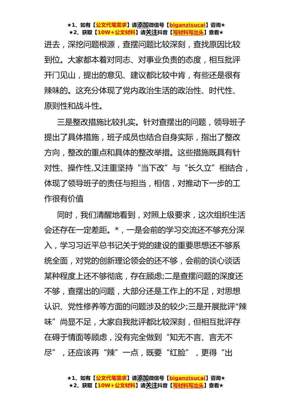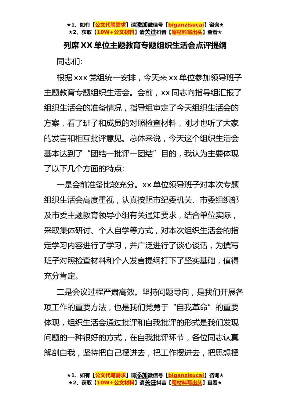 ★1、如有【公文代笔需求】请添加微信号【biganzisucai】咨询★★2、获取【10W+公文材料】请关注抖音【写材料写出头】查看★列席XX单位主题教育专题组织生活会点评提纲同志们:根据xxx党组统一安排,今天来xx单位参加领导班子主题教育专题组织生活会。会前,xx同志向指导组汇报了组织生活会的准备情况,指导组审定了今天组织生活会的方案,看了班子和成员的对照检查材料,刚才也听了大家的发言和相互批评意见。总体来说,今天这个组织生活会基本达到了“团结一批评一团结”目的,我认为主要体现了以下几个方面的特点:一是会前准备比较充分。xx单位领导班子对本次专题组织生活会高度重视,认真按照市纪委机关、市委组织部及市委主题教育领导小组有关通知要求,结合单位实际,采取集体研讨、个人自学等方式,对本次组...