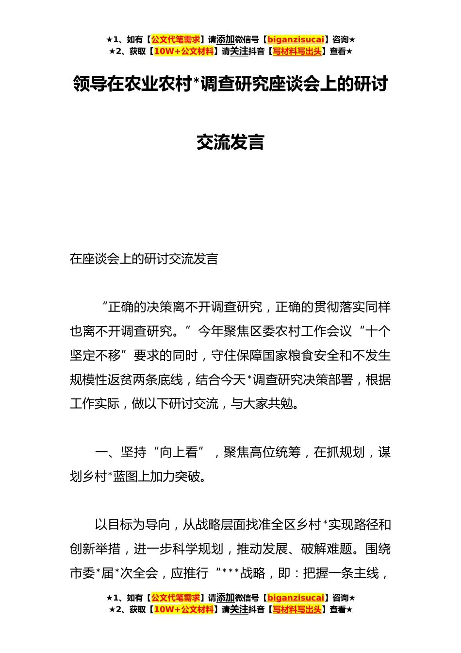 ★1、如有【公文代笔需求】请添加微信号【biganzisucai】咨询★★2、获取【10W+公文材料】请关注抖音【写材料写出头】查看★领导在农业农村*调查研究座谈会上的研讨交流发言在座谈会上的研讨交流发言“正确的决策离不开调查研究,正确的贯彻落实同样也离不开调查研究。”今年聚焦区委农村工作会议“十个坚定不移”要求的同时,守住保障国家粮食安全和不发生规模性返贫两条底线,结合今天*调查研究决策部署,根据工作实际,做以下研讨交流,与大家共勉。一、坚持“向上看”,聚焦高位统筹,在抓规划,谋划乡村*蓝图上加力突破。以目标为导向,从战略层面找准全区乡村*实现路径和创新举措,进一步科学规划,推动发展、破解难题。围绕市委*届*次全会,应推行“***战略,即:把握一条主线,★1、如有【公文代笔需求】...