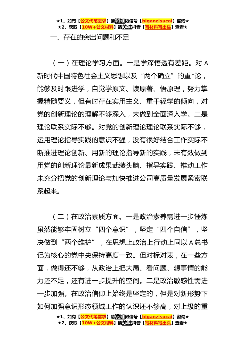 ★1、如有【公文代笔需求】请添加微信号【biganzisucai】咨询★★2、获取【10W+公文材料】请关注抖音【写材料写出头】查看★关于主题教育组织生活会班子成员个人对照检查材料(素质能力、担当作为、检视剖析,发言提纲)主题教育专题组织生活会班子成员个人对照检查材料范文按照主题教育工作部署安排,本人通过个人自学、集中研讨,认真学习A新时代中国特色社会主义思想以及党的二十大精神、党章、《A著作宣读》《A新时代中国特色社会主义思想专题摘编》等学习材料,坚持读原文、学原著、悟原理,对照理论学习、政治素质、能力本领、担当作为、工作作风、廉洁自律等六个方面,全面深入自我检讨剖析,结合具体事例分析问题产生的原因,并提出今后努力方向和整改措施。★1、如有【公文代笔需求】请添加微信号【bigan...