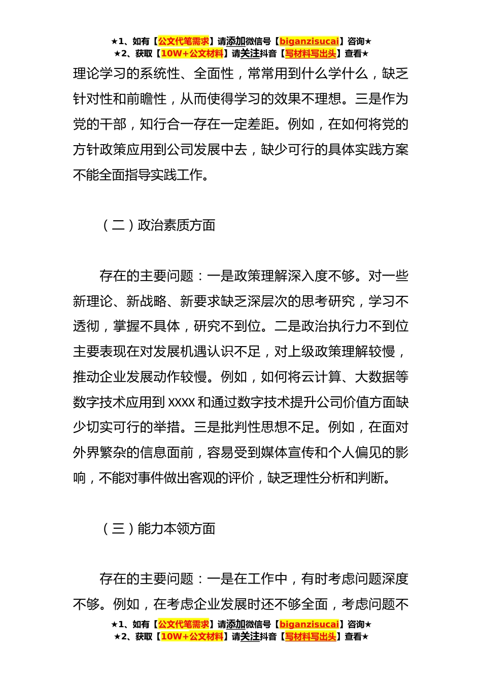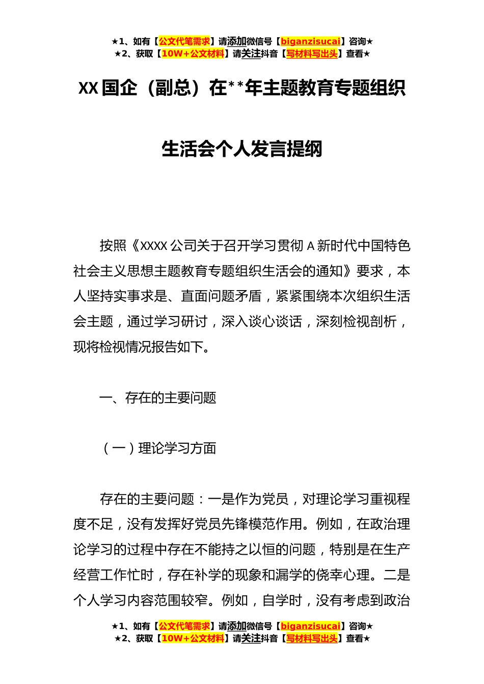 ★1、如有【公文代笔需求】请添加微信号【biganzisucai】咨询★★2、获取【10W+公文材料】请关注抖音【写材料写出头】查看★XX国企(副总)在**年主题教育专题组织生活会个人发言提纲按照《XXXX公司关于召开学习贯彻A新时代中国特色社会主义思想主题教育专题组织生活会的通知》要求,本人坚持实事求是、直面问题矛盾,紧紧围绕本次组织生活会主题,通过学习研讨,深入谈心谈话,深刻检视剖析,现将检视情况报告如下。一、存在的主要问题(一)理论学习方面存在的主要问题:一是作为党员,对理论学习重视程度不足,没有发挥好党员先锋模范作用。例如,在政治理论学习的过程中存在不能持之以恒的问题,特别是在生产经营工作忙时,存在补学的现象和漏学的侥幸心理。二是个人学习内容范围较窄。例如,自学时,没有考虑...