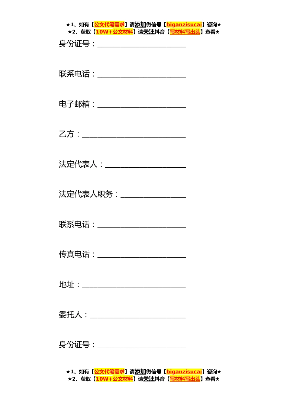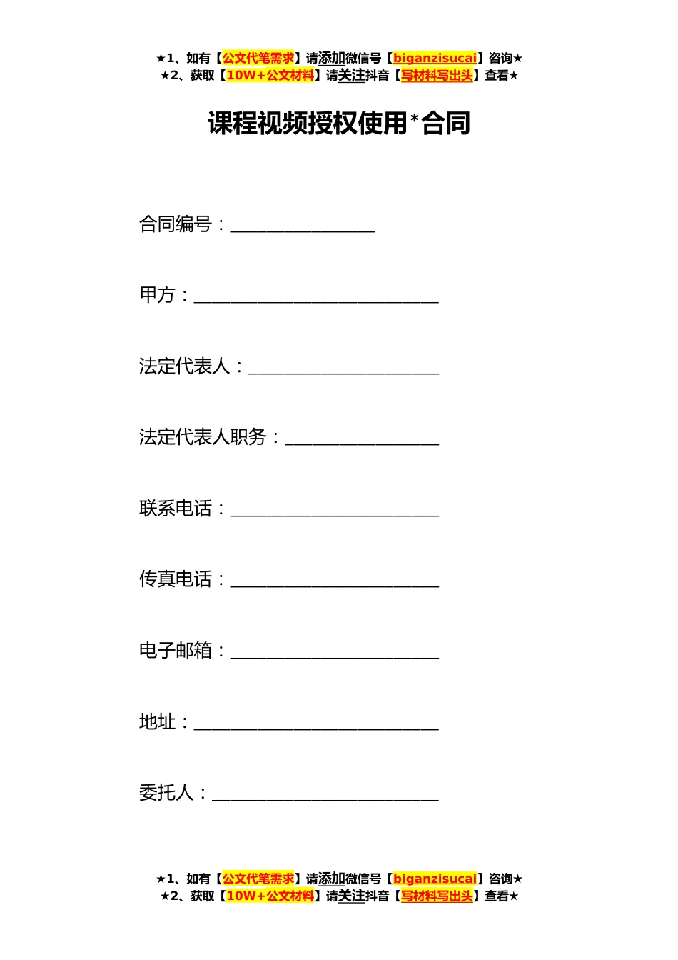 ★1、如有【公文代笔需求】请添加微信号【biganzisucai】咨询★★2、获取【10W+公文材料】请关注抖音【写材料写出头】查看★课程视频授权使用*合同合同编号:________________甲方:___________________________法定代表人:_____________________法定代表人职务:_________________联系电话:_______________________传真电话:_______________________电子邮箱:_______________________地址:___________________________委托人:_________________________★1、如有【公文代笔需求】请添加微信号【biganzisucai】咨询★★2、获取【10W+公文材料】请关注抖音【写材料写出头】查看★★1、如有【公文代笔需求】请添加微信号【biganzisucai】咨询★★2、获取【10W+公文材料】请关注抖音【写材料写出头】查看★身份...