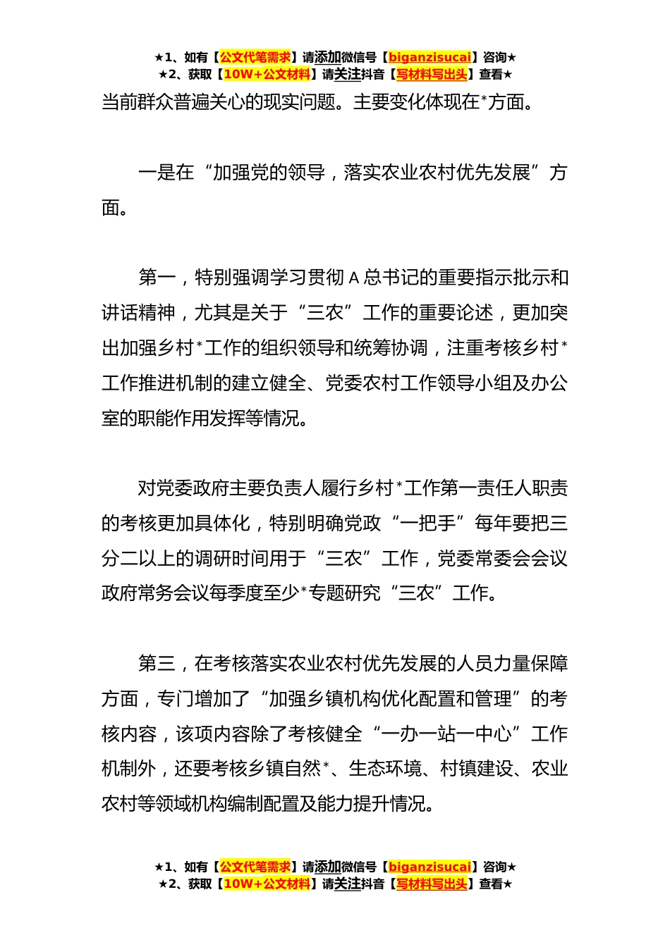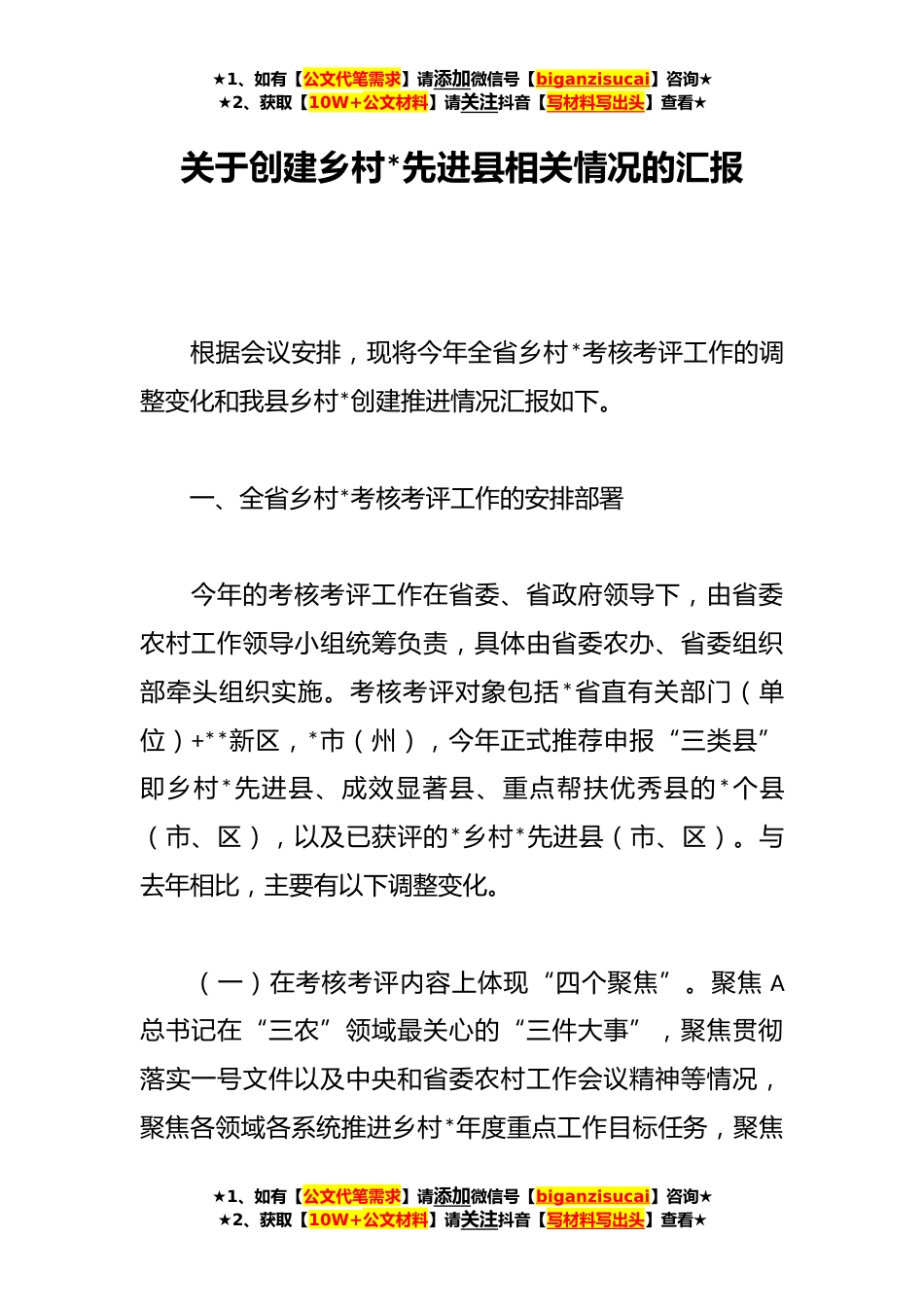 ★1、如有【公文代笔需求】请添加微信号【biganzisucai】咨询★★2、获取【10W+公文材料】请关注抖音【写材料写出头】查看★关于创建乡村*先进县相关情况的汇报根据会议安排,现将今年全省乡村*考核考评工作的调整变化和我县乡村*创建推进情况汇报如下。一、全省乡村*考核考评工作的安排部署今年的考核考评工作在省委、省政府领导下,由省委农村工作领导小组统筹负责,具体由省委农办、省委组织部牵头组织实施。考核考评对象包括*省直有关部门(单位)+**新区,*市(州),今年正式推荐申报“三类县”即乡村*先进县、成效显著县、重点帮扶优秀县的*个县(市、区),以及已获评的*乡村*先进县(市、区)。与去年相比,主要有以下调整变化。(一)在考核考评内容上体现“四个聚焦”。聚焦A总书记在“三农”领域最关...