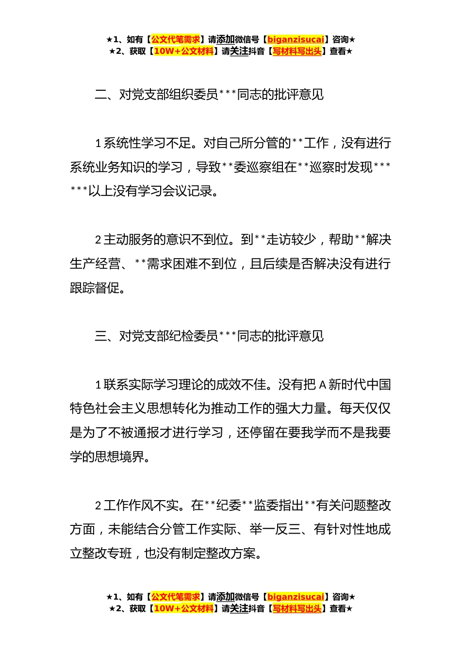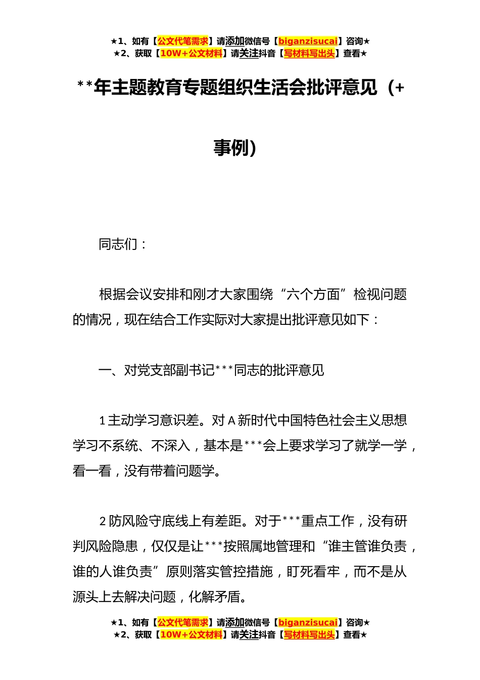 ★1、如有【公文代笔需求】请添加微信号【biganzisucai】咨询★★2、获取【10W+公文材料】请关注抖音【写材料写出头】查看★**年主题教育专题组织生活会批评意见(+事例)同志们:根据会议安排和刚才大家围绕“六个方面”检视问题的情况,现在结合工作实际对大家提出批评意见如下:一、对党支部副书记***同志的批评意见1主动学习意识差。对A新时代中国特色社会主义思想学习不系统、不深入,基本是***会上要求学习了就学一学,看一看,没有带着问题学。2防风险守底线上有差距。对于***重点工作,没有研判风险隐患,仅仅是让***按照属地管理和“谁主管谁负责,谁的人谁负责”原则落实管控措施,盯死看牢,而不是从源头上去解决问题,化解矛盾。★1、如有【公文代笔需求】请添加微信号【biganzisucai】咨询★★2、获...
