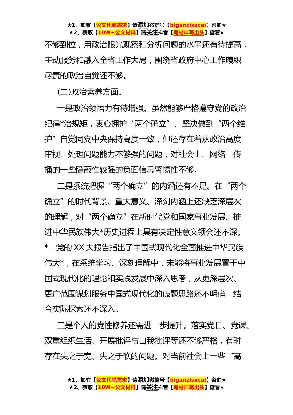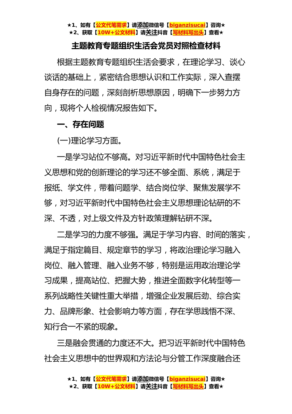 ★1、如有【公文代笔需求】请添加微信号【biganzisucai】咨询★★2、获取【10W+公文材料】请关注抖音【写材料写出头】查看★主题教育专题组织生活会党员对照检查材料根据主题教育专题组织生活会要求,在理论学习、谈心谈话的基础上,紧密结合思想认识和工作实际,深入查摆自身存在的问题,深刻剖析思想原因,明确下一步努力方向,现将个人检视情况报告如下。一、存在问题(一)理论学习方面。一是学习站位不够高。对习近平新时代中国特色社会主义思想和党的创新理论的学习还不够全面、系统,满足于报纸、学文件,带着问题学、结合岗位学、聚焦发展学不够,对习近平新时代中国特色社会主义思想理论钻研的不深、不透,对上级文件及方针政策理解钻研不深。二是学习的力度不够强。满足于学习内容、时间的落实,满足于指...