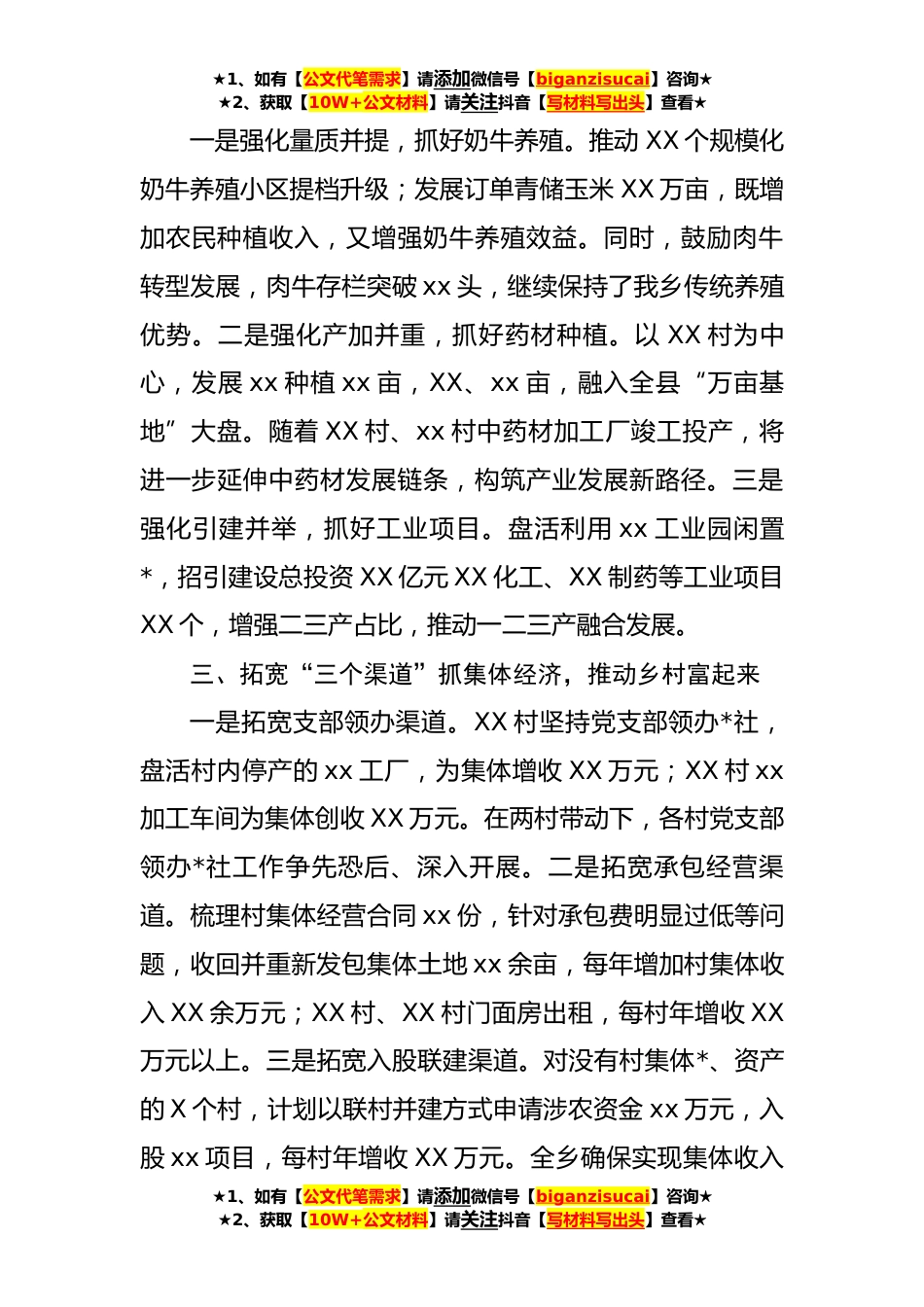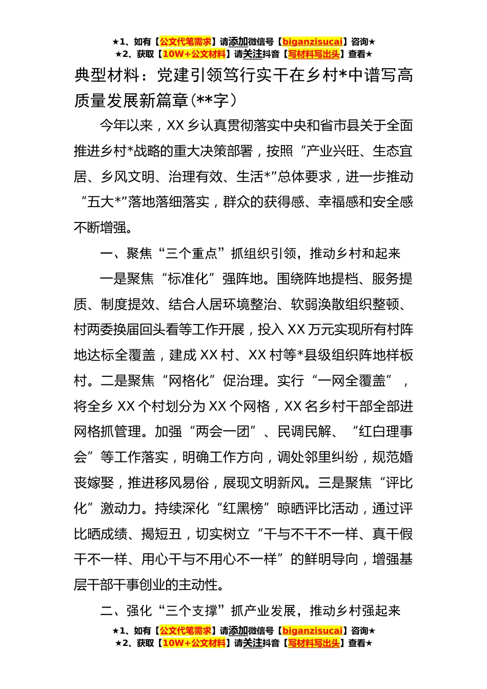★1、如有【公文代笔需求】请添加微信号【biganzisucai】咨询★★2、获取【10W+公文材料】请关注抖音【写材料写出头】查看★典型材料:党建引领笃行实干在乡村*中谱写高质量发展新篇章(**字)今年以来,XX乡认真贯彻落实中央和省市县关于全面推进乡村*战略的重大决策部署,按照“产业兴旺、生态宜居、乡风文明、治理有效、生活*”总体要求,进一步推动“五大*”落地落细落实,群众的获得感、幸福感和安全感不断增强。一、聚焦“三个重点”抓组织引领,推动乡村和起来一是聚焦“标准化”强阵地。围绕阵地提档、服务提质、制度提效、结合人居环境整治、软弱涣散组织整顿、村两委换届回头看等工作开展,投入XX万元实现所有村阵地达标全覆盖,建成XX村、XX村等*县级组织阵地样板村。二是聚焦“网格化”促治理。实行“...