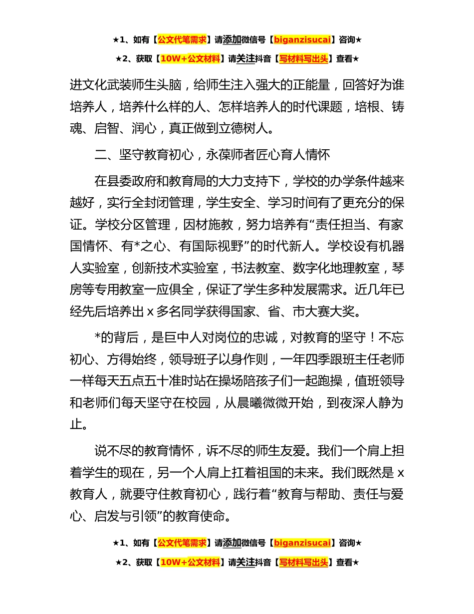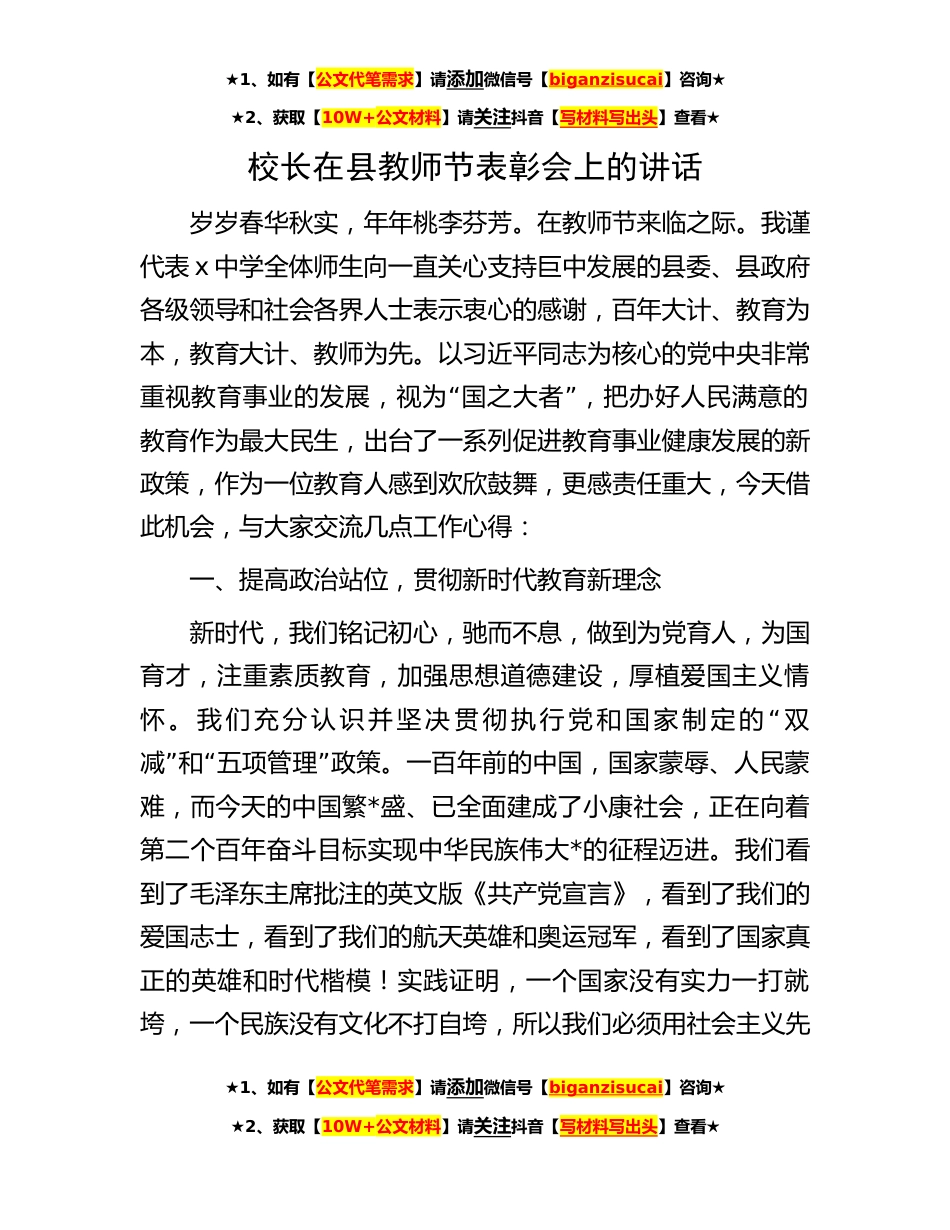 ★1、如有【公文代笔需求】请添加微信号【biganzisucai】咨询★★2、获取【10W+公文材料】请关注抖音【写材料写出头】查看★校长在县教师节表彰会上的讲话岁岁春华秋实,年年桃李芬芳。在教师节来临之际。我谨代表x中学全体师生向一直关心支持巨中发展的县委、县政府各级领导和社会各界人士表示衷心的感谢,百年大计、教育为本,教育大计、教师为先。以习近平同志为核心的党中央非常“”重视教育事业的发展,视为国之大者,把办好人民满意的教育作为最大民生,出台了一系列促进教育事业健康发展的新政策,作为一位教育人感到欢欣鼓舞,更感责任重大,今天借此机会,与大家交流几点工作心得:一、提高政治站位,贯彻新时代教育新理念新时代,我们铭记初心,驰而不息,做到为党育人,为国育才,注重素质教育,加强思...
