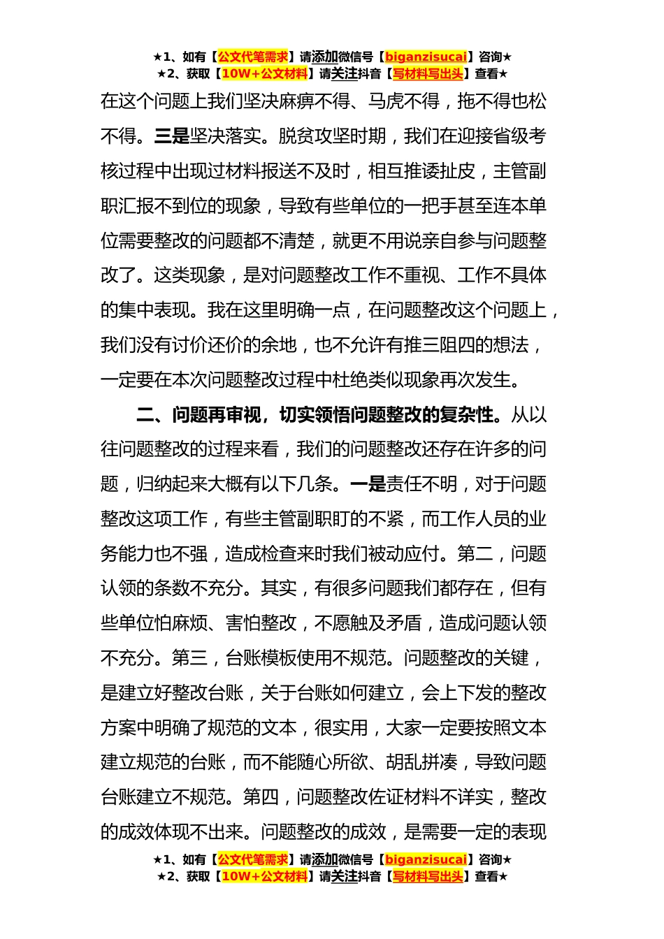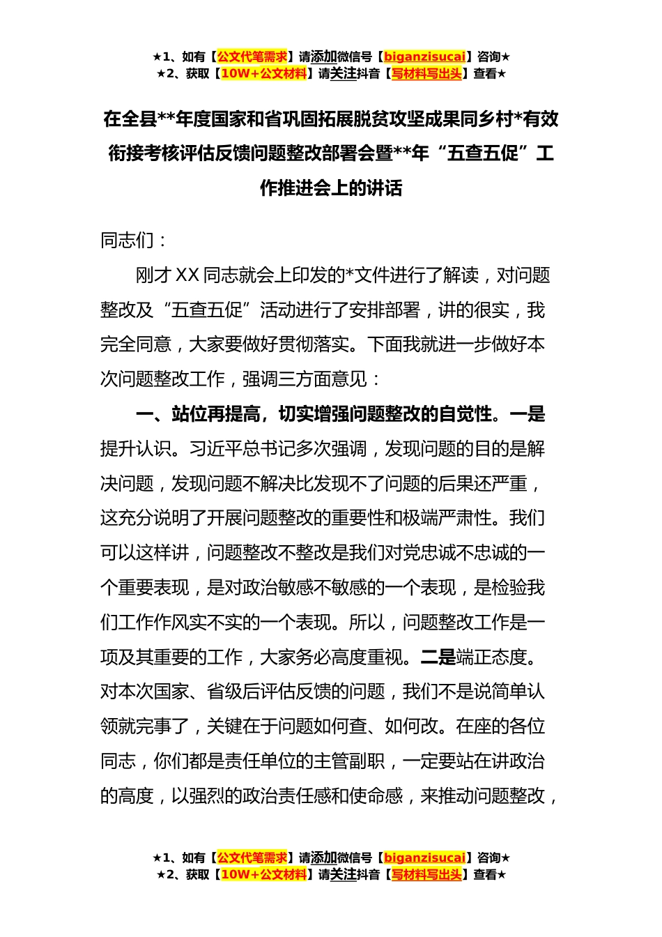 ★1、如有【公文代笔需求】请添加微信号【biganzisucai】咨询★★2、获取【10W+公文材料】请关注抖音【写材料写出头】查看★在全县**年度国家和省巩固拓展脱贫攻坚成果同乡村*有效衔接考核评估反馈问题整改部署会暨**年“五查五促”工作推进会上的讲话同志们:刚才XX同志就会上印发的*文件进行了解读,对问题整改及“五查五促”活动进行了安排部署,讲的很实,我完全同意,大家要做好贯彻落实。下面我就进一步做好本次问题整改工作,强调三方面意见:一、站位再提高,切实增强问题整改的自觉性。一是提升认识。习近平总书记多次强调,发现问题的目的是解决问题,发现问题不解决比发现不了问题的后果还严重,这充分说明了开展问题整改的重要性和极端严肃性。我们可以这样讲,问题整改不整改是我们对党忠诚不忠诚的...