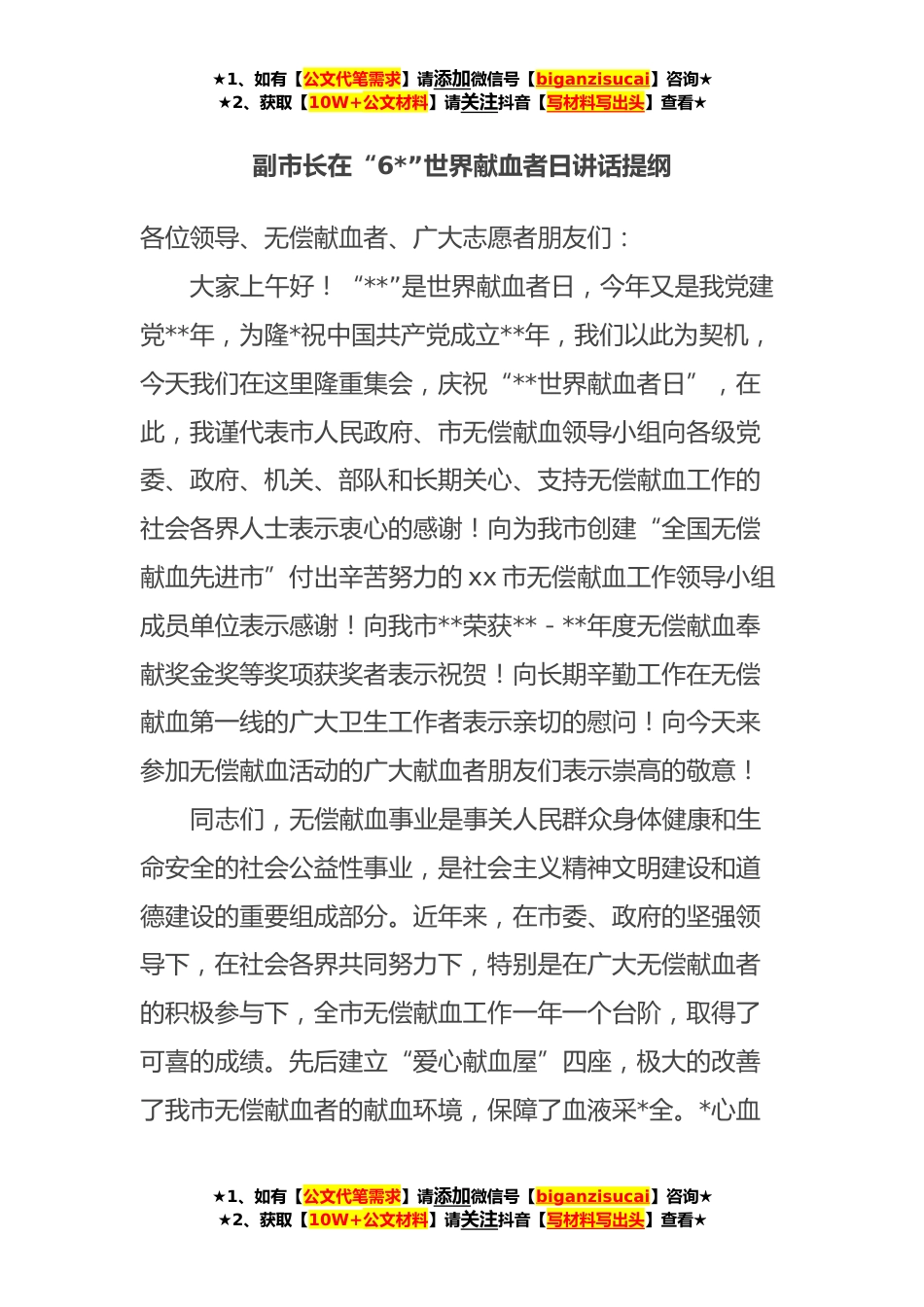★1、如有【公文代笔需求】请添加微信号【biganzisucai】咨询★★2、获取【10W+公文材料】请关注抖音【写材料写出头】查看★副市长在“6*”世界献血者日讲话提纲各位领导、无偿献血者、广大志愿者朋友们:大家上午好!“**”是世界献血者日,今年又是我党建党**年,为隆*祝中国共产党成立**年,我们以此为契机,今天我们在这里隆重集会,庆祝“**世界献血者日”,在此,我谨代表市人民政府、市无偿献血领导小组向各级党委、政府、机关、部队和长期关心、支持无偿献血工作的社会各界人士表示衷心的感谢!向为我市创建“全国无偿献血先进市”付出辛苦努力的xx市无偿献血工作领导小组成员单位表示感谢!向我市**荣获**-**年度无偿献血奉献奖金奖等奖项获奖者表示祝贺!向长期辛勤工作在无偿献血第一线的广大卫生工作...