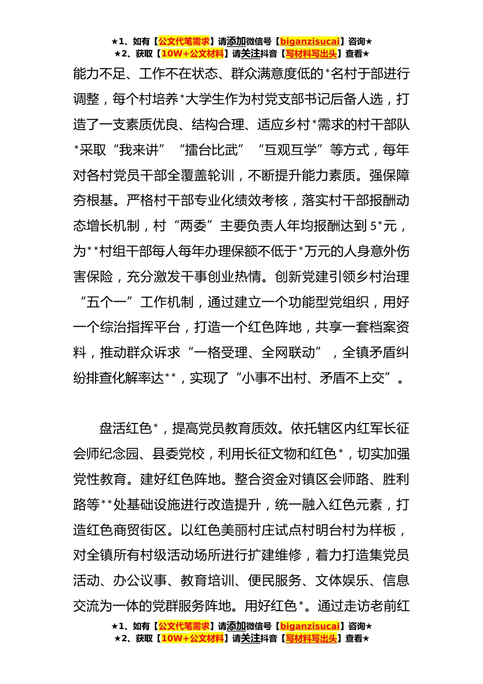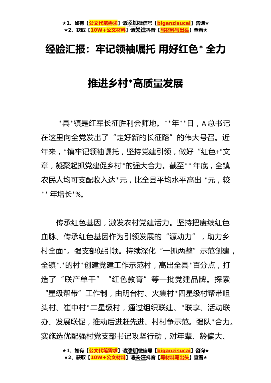 ★1、如有【公文代笔需求】请添加微信号【biganzisucai】咨询★★2、获取【10W+公文材料】请关注抖音【写材料写出头】查看★经验汇报:牢记领袖嘱托用好红色*全力推进乡村*高质量发展*县*镇是红军长征胜利会师地。**年**日,A总书记在这里向全党发出了“走好新的长征路”的伟大号召。近年来,*镇牢记领袖嘱托,坚持党建引领,做好“红色+”文章,凝聚起抓党建促乡村*的强大合力。截至**年底,全镇农民人均可支配收入达*元,比全县平均水平高出*元,较**年增长*%。传承红色基因,激发农村党建活力。坚持把赓续红色血脉、传承红色基因作为引领发展的“源动力”,助力乡村全面*。强支部促引领。持续深化“一抓两整”示范创建,全镇*.*的村*创建党建工作示范村,高出全县*百分点,打造了“联产单干”“红色教育”等一...