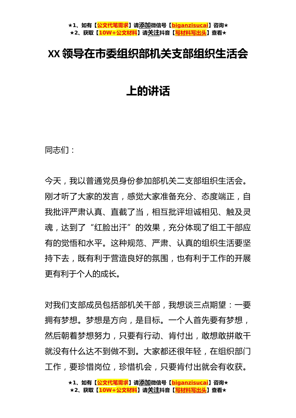 ★1、如有【公文代笔需求】请添加微信号【biganzisucai】咨询★★2、获取【10W+公文材料】请关注抖音【写材料写出头】查看★XX领导在市委组织部机关支部组织生活会上的讲话同志们:今天,我以普通党员身份参加部机关二支部组织生活会。刚才听了大家的发言,感觉大家准备充分、态度端正,自我批评严肃认真、直截了当,相互批评坦诚相见、触及灵魂,达到了“红脸出汗”的效果,充分体现了组工干部应有的觉悟和水平。这种规范、严肃、认真的组织生活要坚持下去,既有利于营造良好的氛围,也有利于工作的开展更有利于个人的成长。对我们支部成员包括部机关干部,我想谈三点期望:一要拥有梦想。梦想是方向,是目标。一个人首先要有梦想,然后朝着梦想努力,只要有行动、肯付出,敢想敢拼敢干就没有什么达不到做不到。...