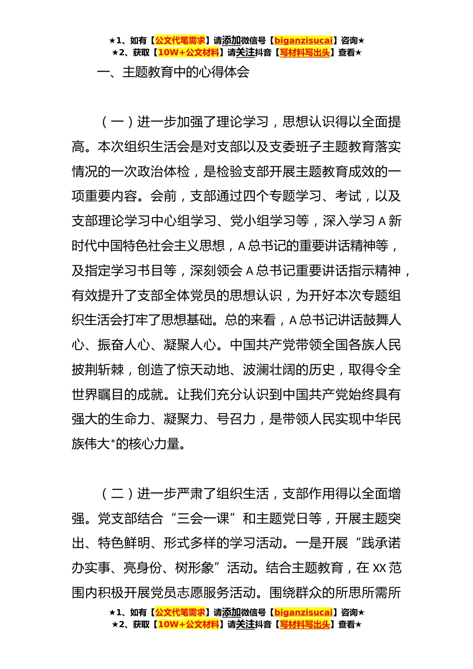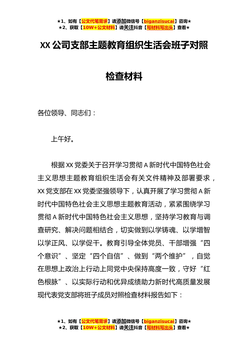 ★1、如有【公文代笔需求】请添加微信号【biganzisucai】咨询★★2、获取【10W+公文材料】请关注抖音【写材料写出头】查看★XX公司支部主题教育组织生活会班子对照检查材料各位领导、同志们:上午好。根据XX党委关于召开学习贯彻A新时代中国特色社会主义思想主题教育组织生活会有关文件精神及部署要求,XX党支部在XX党委坚强领导下,认真开展了学习贯彻A新时代中国特色社会主义思想主题教育活动,紧紧围绕学习贯彻A新时代中国特色社会主义思想,坚持学习教育与调查研究、解决问题相结合,切实做到以学铸魂、以学增智以学正风、以学促干。教育引导全体党员、干部增强“四个意识”、坚定“四个自信”、做到“两个维护”,自觉在思想上政治上行动上同党中央保持高度一致,守好“红色根脉”、以实际行动和优异成绩助力...