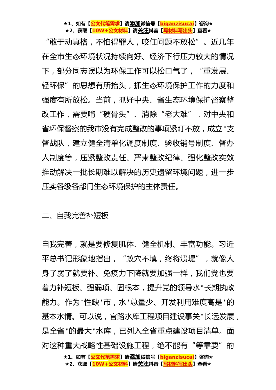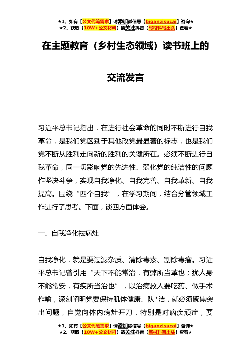 ★1、如有【公文代笔需求】请添加微信号【biganzisucai】咨询★★2、获取【10W+公文材料】请关注抖音【写材料写出头】查看★在主题教育(乡村生态领域)读书班上的交流发言习近平总书记指出,在进行社会革命的同时不断进行自我革命,是我们党区别于其他政党最显著的标志,也是我们党不断从胜利走向新的胜利的关键所在。必须不断进行自我革命,同一切影响党的先进性、弱化党的纯洁性的问题作坚决斗争,实现自我净化、自我完善、自我革新、自我提高。围绕“四个自我”,在学习期间,结合分管领域工作进行了思考。下面,谈四方面体会。一、自我净化祛病灶自我净化,就是要过滤杂质、清除毒素、割除毒瘤。习近平总书记曾引用“天下不能常治,有弊所当革也;犹人身不能常安,有疾所当治也”,以治病救人要吃药、做手术...