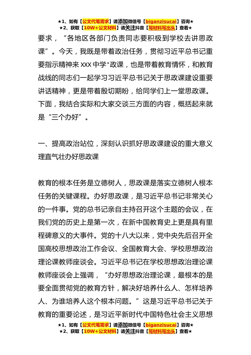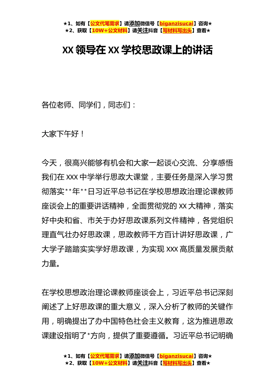 ★1、如有【公文代笔需求】请添加微信号【biganzisucai】咨询★★2、获取【10W+公文材料】请关注抖音【写材料写出头】查看★XX领导在XX学校思政课上的讲话各位老师、同学们,同志们:大家下午好!今天,很高兴能够有机会和大家一起谈心交流、分享感悟我们在XXX中学举行思政大课堂,主要任务是深入学习贯彻落实**年**日习近平总书记在学校思想政治理论课教师座谈会上的重要讲话精神,全面贯彻党的XX大精神,落实好中央和省、市关于办好思政课系列文件精神,各党组织理直气壮办好思政课,思政教师千方百计讲好思政课,广大学子踏踏实实学好思政课,为实现XXX高质量发展贡献力量。在学校思想政治理论课教师座谈会上,习近平总书记深刻阐述了上好思政课的重大意义,深入分析了教师的关键作用,明确提出了办中国特色社...