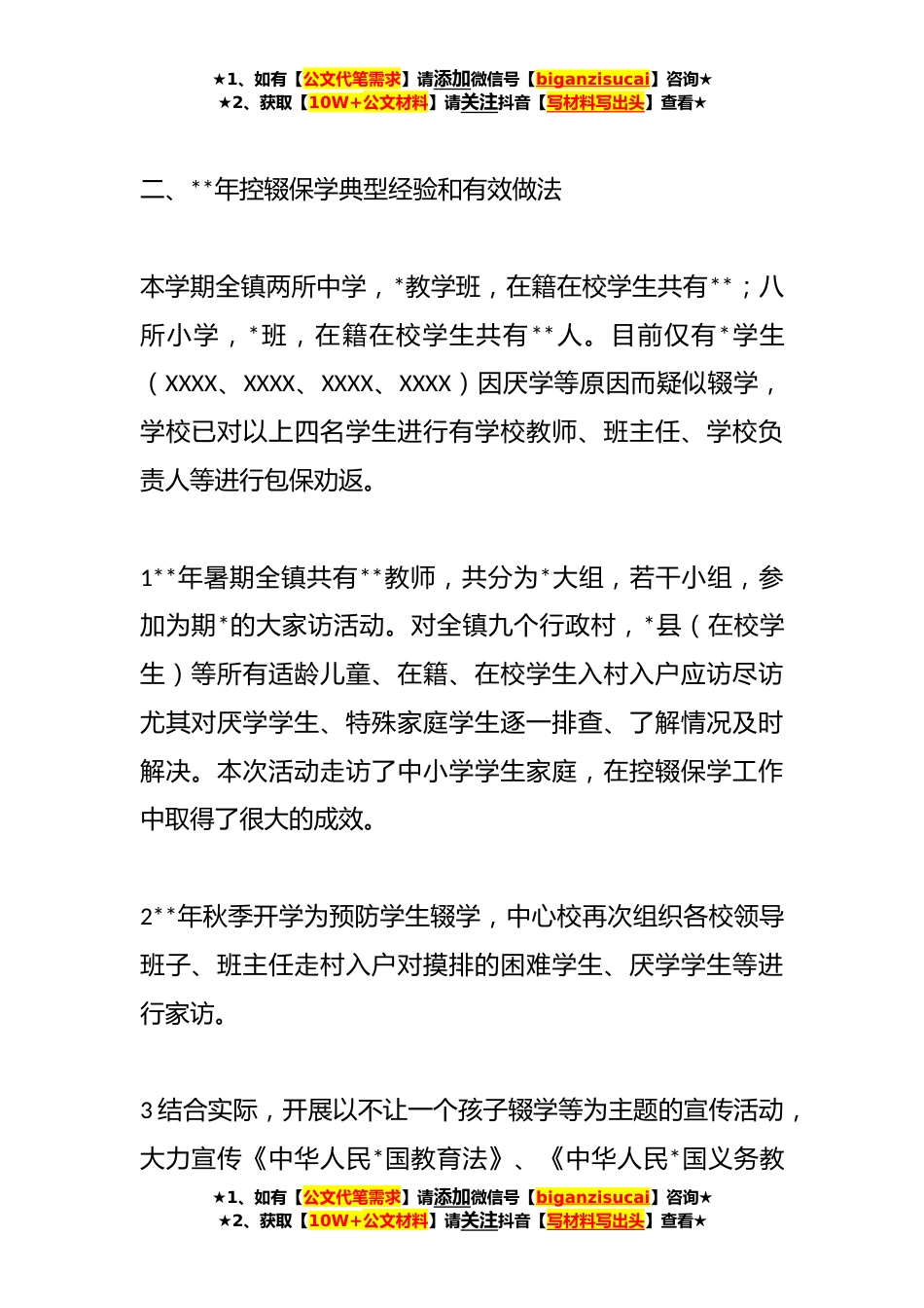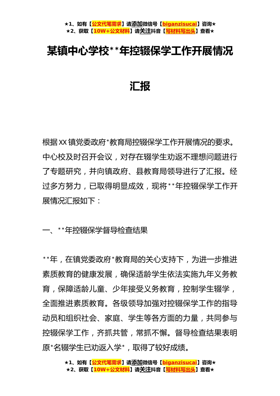 ★1、如有【公文代笔需求】请添加微信号【biganzisucai】咨询★★2、获取【10W+公文材料】请关注抖音【写材料写出头】查看★某镇中心学校**年控辍保学工作开展情况汇报根据XX镇党委政府*教育局控辍保学工作开展情况的要求。中心校及时召开会议,对存在辍学生劝返不理想问题进行了专题研究,并向镇政府、县教育局领导进行了汇报。经过多方努力,已取得明显成效,现将**年控辍保学工作开展情况汇报如下:一、**年控辍保学督导检查结果**年,在镇党委政府*教育局的关心支持下,为进一步推进素质教育的健康发展,确保适龄学生依法实施九年义务教育,保障适龄儿童、少年接受义务教育,控制学生辍学,全面推进素质教育。各级领导加强对控辍保学工作的指导动员和组织社会、家庭、学生等各方面的力量,共同参与控辍保学工...