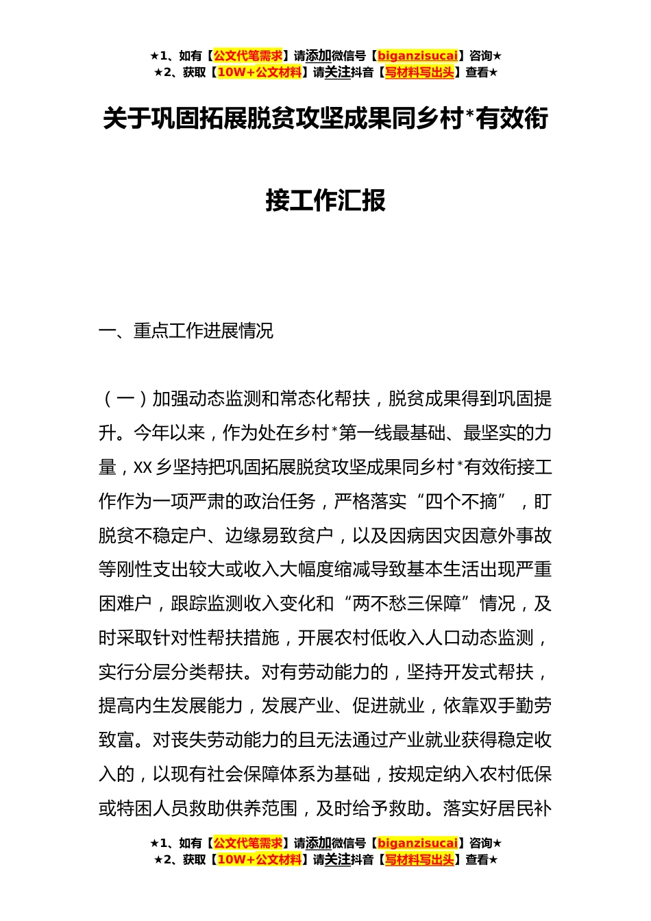★1、如有【公文代笔需求】请添加微信号【biganzisucai】咨询★★2、获取【10W+公文材料】请关注抖音【写材料写出头】查看★关于巩固拓展脱贫攻坚成果同乡村*有效衔接工作汇报一、重点工作进展情况(一)加强动态监测和常态化帮扶,脱贫成果得到巩固提升。今年以来,作为处在乡村*第一线最基础、最坚实的力量,XX乡坚持把巩固拓展脱贫攻坚成果同乡村*有效衔接工作作为一项严肃的政治任务,严格落实“四个不摘”,盯脱贫不稳定户、边缘易致贫户,以及因病因灾因意外事故等刚性支出较大或收入大幅度缩减导致基本生活出现严重困难户,跟踪监测收入变化和“两不愁三保障”情况,及时采取针对性帮扶措施,开展农村低收入人口动态监测,实行分层分类帮扶。对有劳动能力的,坚持开发式帮扶,提高内生发展能力,发展产业、...
