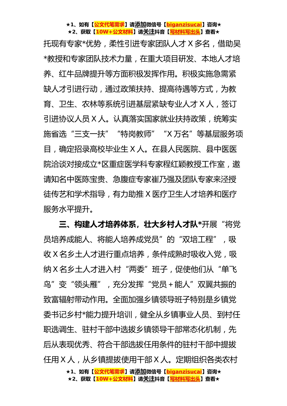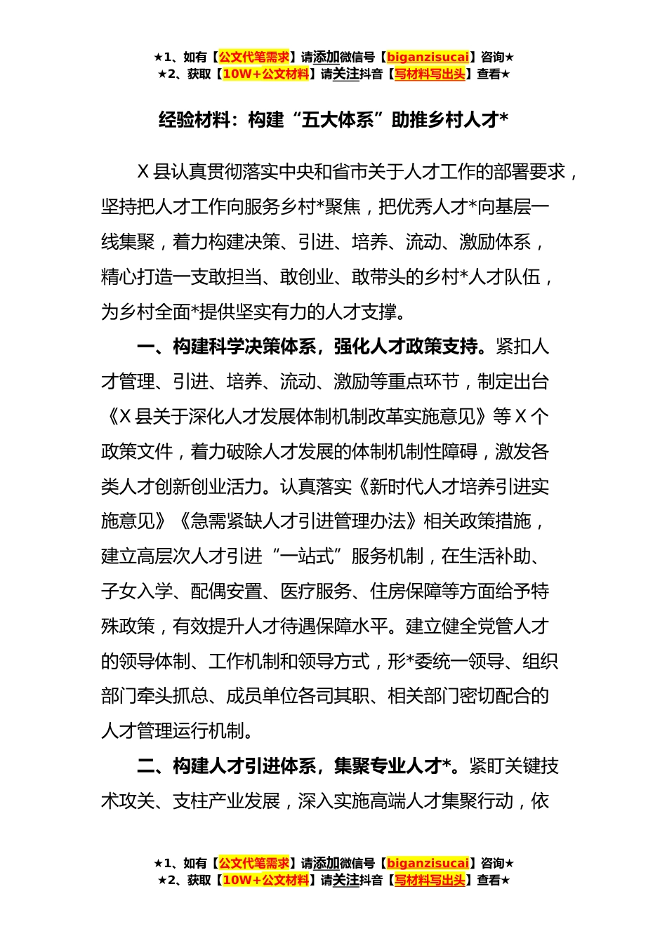 ★1、如有【公文代笔需求】请添加微信号【biganzisucai】咨询★★2、获取【10W+公文材料】请关注抖音【写材料写出头】查看★经验材料:构建“五大体系”助推乡村人才*X县认真贯彻落实中央和省市关于人才工作的部署要求,坚持把人才工作向服务乡村*聚焦,把优秀人才*向基层一线集聚,着力构建决策、引进、培养、流动、激励体系,精心打造一支敢担当、敢创业、敢带头的乡村*人才队伍,为乡村全面*提供坚实有力的人才支撑。一、构建科学决策体系,强化人才政策支持。紧扣人才管理、引进、培养、流动、激励等重点环节,制定出台《X县关于深化人才发展体制机制改革实施意见》等X个政策文件,着力破除人才发展的体制机制性障碍,激发各类人才创新创业活力。认真落实《新时代人才培养引进实施意见》《急需紧缺人才引进管...