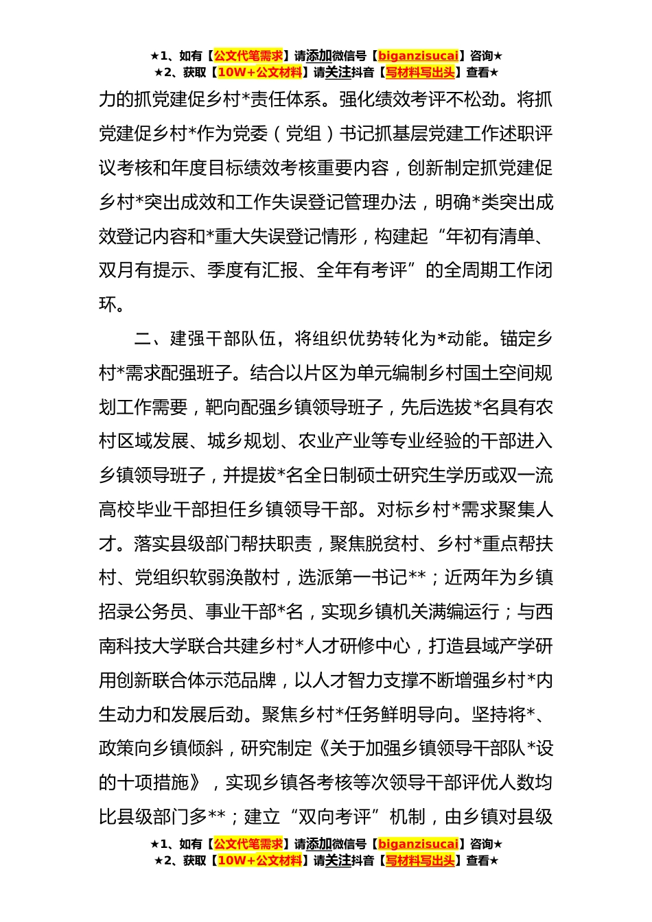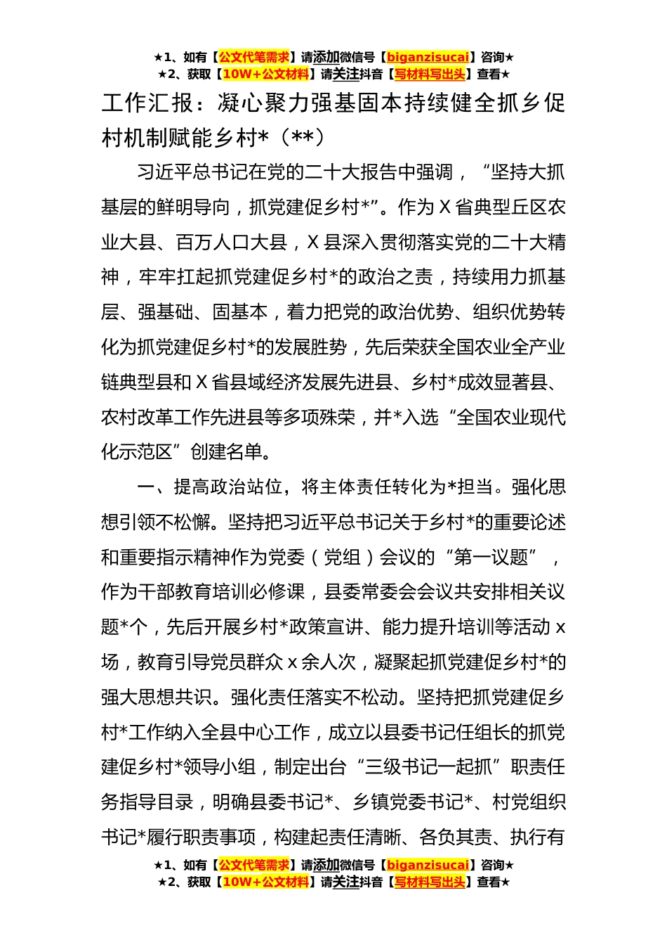 ★1、如有【公文代笔需求】请添加微信号【biganzisucai】咨询★★2、获取【10W+公文材料】请关注抖音【写材料写出头】查看★工作汇报:凝心聚力强基固本持续健全抓乡促村机制赋能乡村*(**)习近平总书记在党的二十大报告中强调,“坚持大抓基层的鲜明导向,抓党建促乡村*”。作为X省典型丘区农业大县、百万人口大县,X县深入贯彻落实党的二十大精神,牢牢扛起抓党建促乡村*的政治之责,持续用力抓基层、强基础、固基本,着力把党的政治优势、组织优势转化为抓党建促乡村*的发展胜势,先后荣获全国农业全产业链典型县和X省县域经济发展先进县、乡村*成效显著县、农村改革工作先进县等多项殊荣,并*入选“全国农业现代化示范区”创建名单。一、提高政治站位,将主体责任转化为*担当。强化思想引领不松懈。坚持把习...