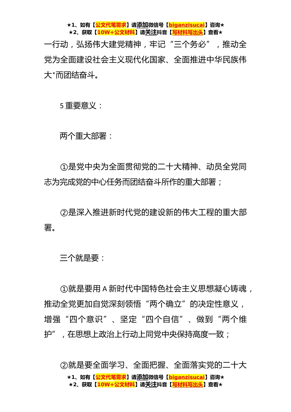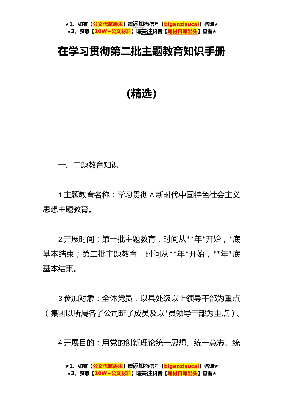 ★1、如有【公文代笔需求】请添加微信号【biganzisucai】咨询★★2、获取【10W+公文材料】请关注抖音【写材料写出头】查看★在学习贯彻第二批主题教育知识手册(精选)一、主题教育知识1主题教育名称:学习贯彻A新时代中国特色社会主义思想主题教育。2开展时间:第一批主题教育,时间从**年*开始,*底基本结束;第二批主题教育,时间从**年*开始,**年*底基本结束。3参加对象:全体党员,以县处级以上领导干部为重点(集团以所属各子公司班子成员及以*员领导干部为重点)。4开展目的:用党的创新理论统一思想、统一意志、统★1、如有【公文代笔需求】请添加微信号【biganzisucai】咨询★★2、获取【10W+公文材料】请关注抖音【写材料写出头】查看★★1、如有【公文代笔需求】请添加微信号【biganzisucai】咨询★★...
