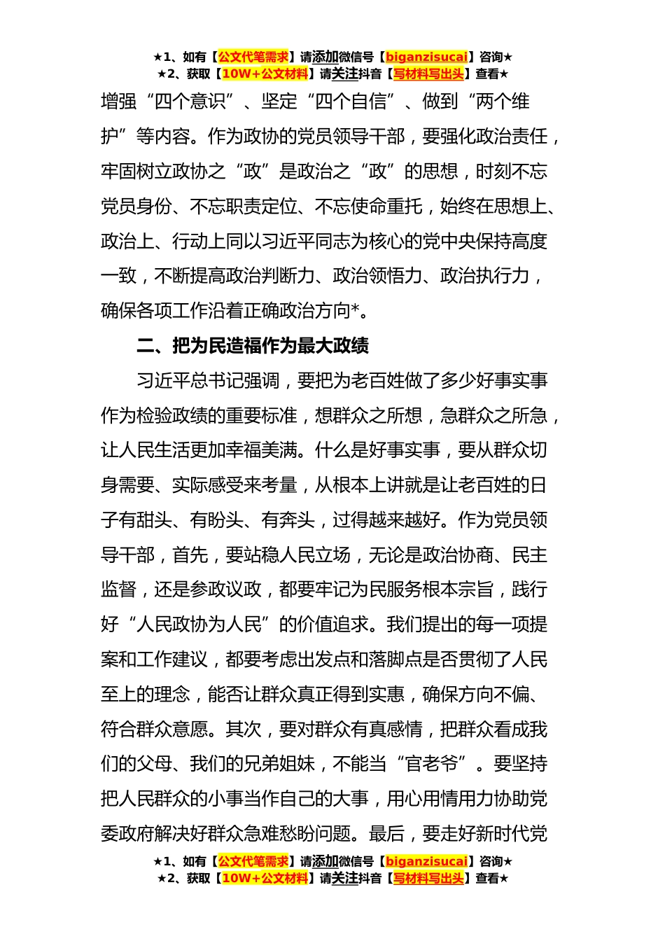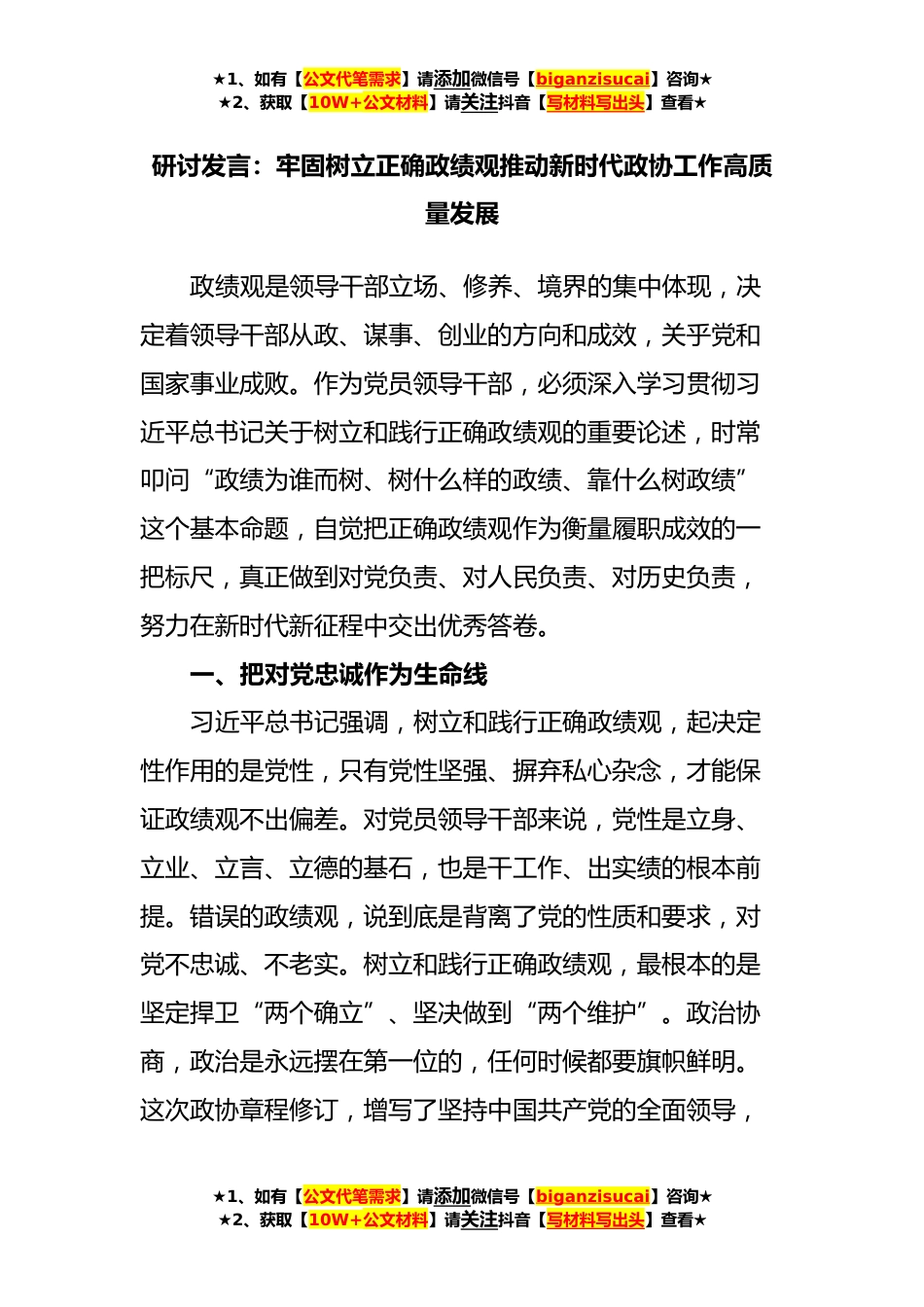★1、如有【公文代笔需求】请添加微信号【biganzisucai】咨询★★2、获取【10W+公文材料】请关注抖音【写材料写出头】查看★研讨发言:牢固树立正确政绩观推动新时代政协工作高质量发展政绩观是领导干部立场、修养、境界的集中体现,决定着领导干部从政、谋事、创业的方向和成效,关乎党和国家事业成败。作为党员领导干部,必须深入学习贯彻习近平总书记关于树立和践行正确政绩观的重要论述,时常叩问“政绩为谁而树、树什么样的政绩、靠什么树政绩”这个基本命题,自觉把正确政绩观作为衡量履职成效的一把标尺,真正做到对党负责、对人民负责、对历史负责,努力在新时代新征程中交出优秀答卷。一、把对党忠诚作为生命线习近平总书记强调,树立和践行正确政绩观,起决定性作用的是党性,只有党性坚强、摒弃私心杂...
