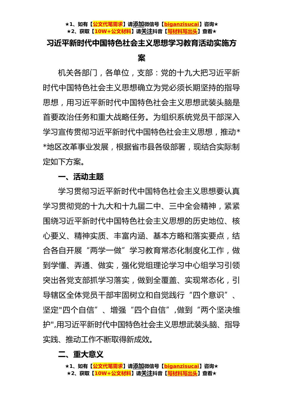 ★1、如有【公文代笔需求】请添加微信号【biganzisucai】咨询★★2、获取【10W+公文材料】请关注抖音【写材料写出头】查看★习近平新时代中国特色社会主义思想学习教育活动实施方案机关各部门,各单位,支部:党的十九大把习近平新时代中国特色社会主义思想确立为党必须长期坚持的指导思想,用习近平新时代中国特色社会主义思想武装头脑是首要政治任务和重大战略任务。为组织系统党员干部深入学习宣传贯彻习近平新时代中国特色社会主义思想,推动**地区改革事业发展,根据省市县各级部署,现结合实际制定如下方案。一、活动主题学习贯彻习近平新时代中国特色社会主义思想要认真学习贯彻党的十九大和十九届二中、三中全会精神,紧紧围绕习近平新时代中国特色社会主义思想的历史地位、核心要义、精神实质、丰富内涵...