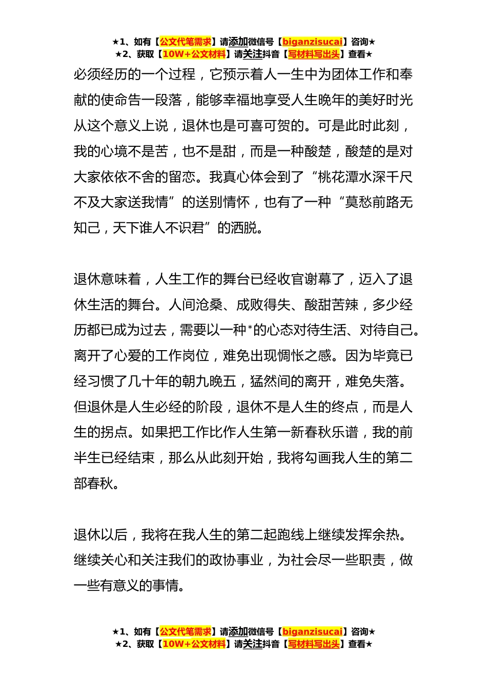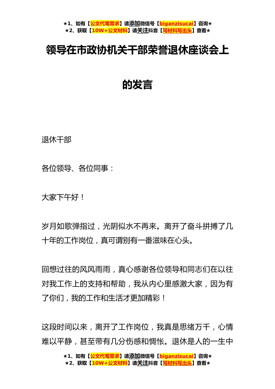 ★1、如有【公文代笔需求】请添加微信号【biganzisucai】咨询★★2、获取【10W+公文材料】请关注抖音【写材料写出头】查看★领导在市政协机关干部荣誉退休座谈会上的发言退休干部各位领导、各位同事:大家下午好!岁月如歌弹指过,光阴似水不再来。离开了奋斗拼搏了几十年的工作岗位,真可谓别有一番滋味在心头。回想过往的风风雨雨,真心感谢各位领导和同志们在以往对我工作上的支持和帮助,我从内心里感激大家,因为有了你们,我的工作和生活才更加精彩!这段时间以来,离开了工作岗位,我真是思绪万千,心情难以平静,甚至带有几分伤感和惆怅。退休是人的一生中★1、如有【公文代笔需求】请添加微信号【biganzisucai】咨询★★2、获取【10W+公文材料】请关注抖音【写材料写出头】查看★★1、如有【公文代笔需求...
