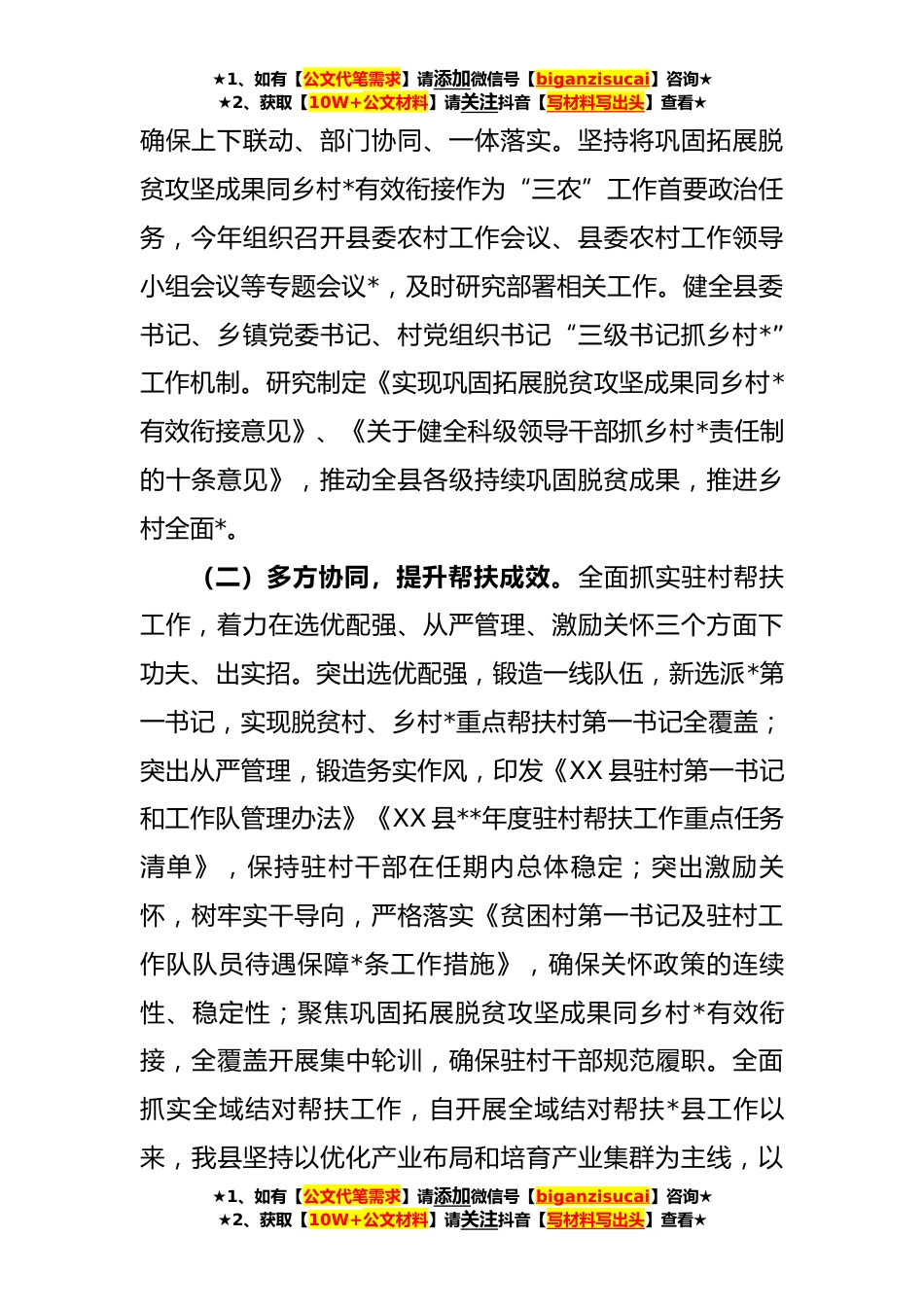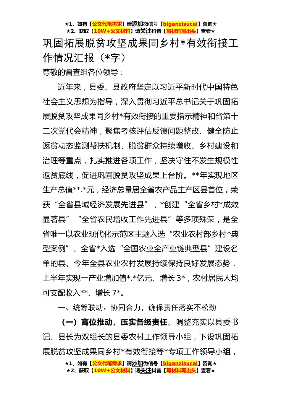 ★1、如有【公文代笔需求】请添加微信号【biganzisucai】咨询★★2、获取【10W+公文材料】请关注抖音【写材料写出头】查看★巩固拓展脱贫攻坚成果同乡村*有效衔接工作情况汇报(*字)尊敬的督查组各位领导:近年来,县委、县政府坚定以习近平新时代中国特色社会主义思想为指导,深入贯彻习近平总书记关于巩固拓展脱贫攻坚成果同乡村*有效衔接的重要指示精神和省第十二次党代会精神,聚焦考核评估反馈问题整改、健全防止返贫动态监测帮扶机制、脱贫群众持续增收、乡村建设和治理等重点,扎实推进各项工作,坚决守住不发生规模性返贫底线,促进巩固脱贫攻坚成果上台阶。**年实现地区生产总值**.*元,经济总量居全省农产品主产区县首位,荣获“全省县域经济发展先进县”,*创建“全省乡村*成效显著县”“全省农民增收...