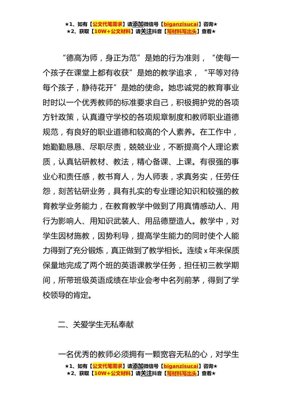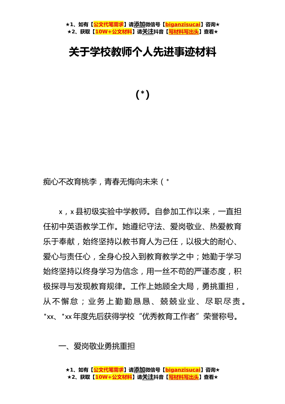 ★1、如有【公文代笔需求】请添加微信号【biganzisucai】咨询★★2、获取【10W+公文材料】请关注抖音【写材料写出头】查看★关于学校教师个人先进事迹材料(*)痴心不改育桃李,青春无悔向未来(*x,x县初级实验中学教师。自参加工作以来,一直担任初中英语教学工作。她遵纪守法、爱岗敬业、热爱教育乐于奉献,始终坚持以教书育人为己任,以极大的耐心、爱心与责任心,全身心投入到教育教学之中;她勤于学习始终坚持以终身学习为信念,用一丝不苟的严谨态度,积极探寻与发现教育规律。工作上她顾全大局,勇挑重担,从不懈怠;业务上勤勤恳恳、兢兢业业、尽职尽责。*xx、*xx年度先后获得学校“优秀教育工作者”荣誉称号。一、爱岗敬业勇挑重担★1、如有【公文代笔需求】请添加微信号【biganzisucai】咨询★★2、获...