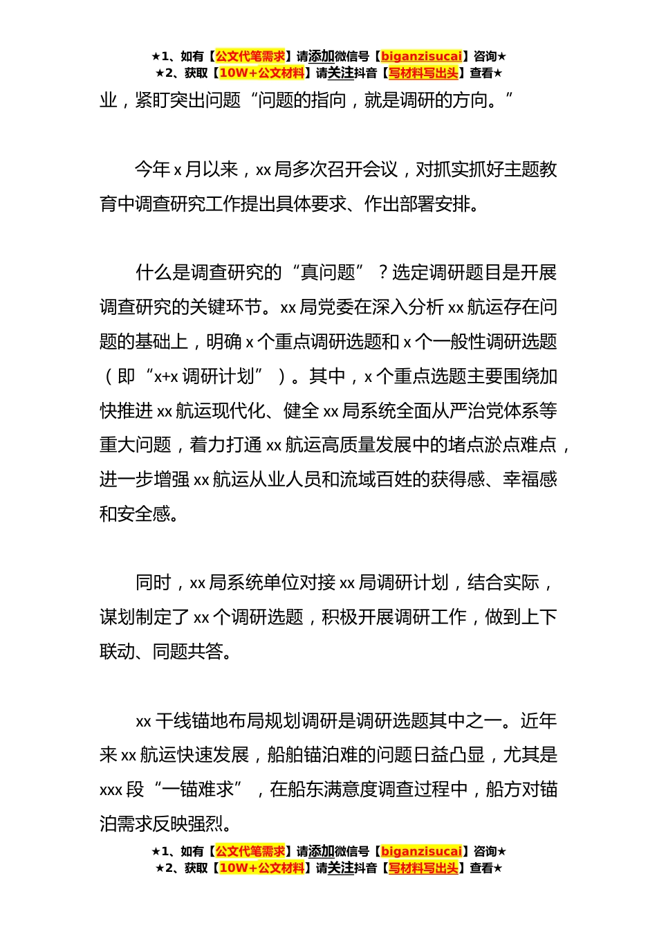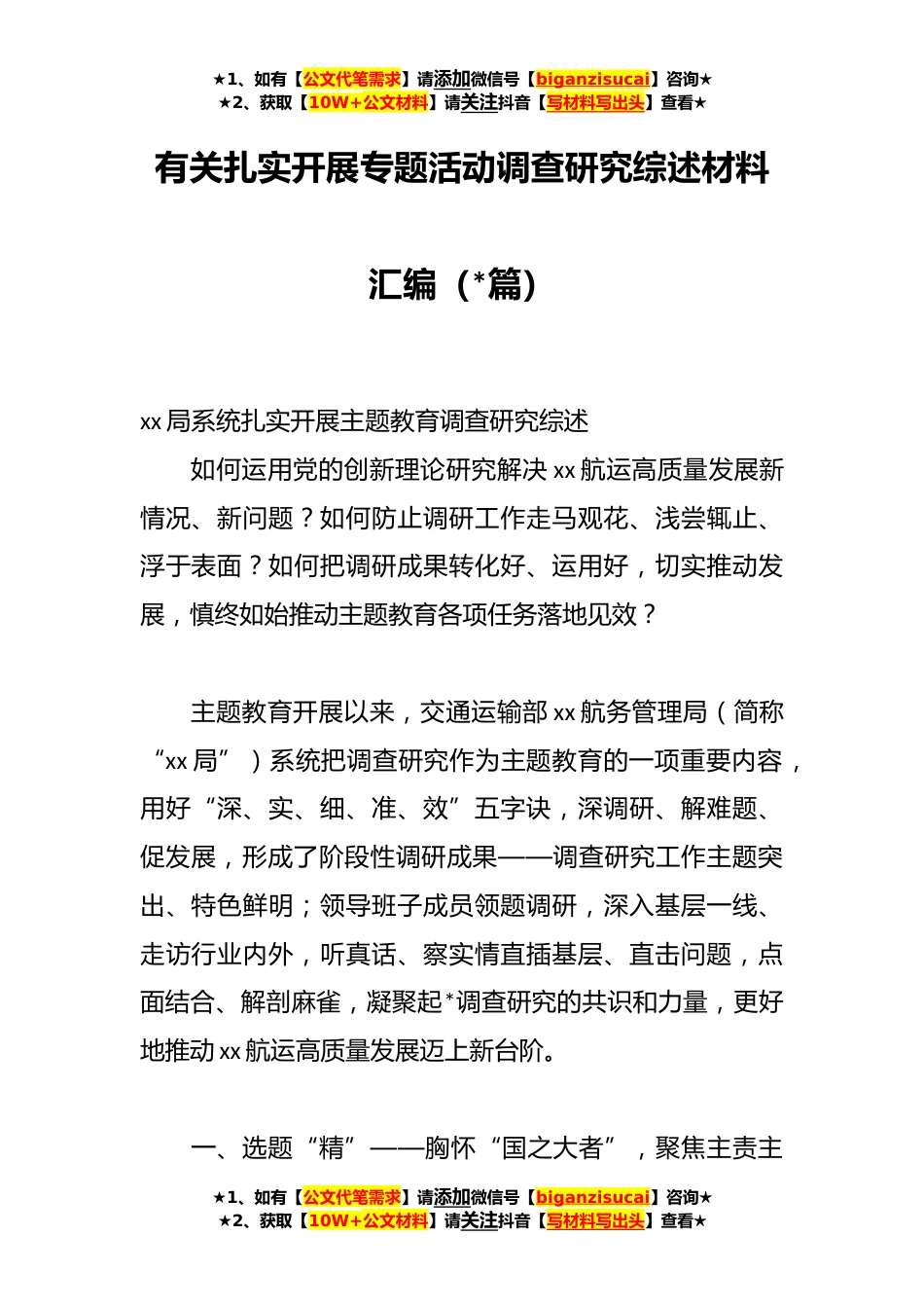 ★1、如有【公文代笔需求】请添加微信号【biganzisucai】咨询★★2、获取【10W+公文材料】请关注抖音【写材料写出头】查看★有关扎实开展专题活动调查研究综述材料汇编(*篇)xx局系统扎实开展主题教育调查研究综述如何运用党的创新理论研究解决xx航运高质量发展新情况、新问题?如何防止调研工作走马观花、浅尝辄止、浮于表面?如何把调研成果转化好、运用好,切实推动发展,慎终如始推动主题教育各项任务落地见效?主题教育开展以来,交通运输部xx航务管理局(简称“xx局”)系统把调查研究作为主题教育的一项重要内容,用好“深、实、细、准、效”五字诀,深调研、解难题、促发展,形成了阶段性调研成果——调查研究工作主题突出、特色鲜明;领导班子成员领题调研,深入基层一线、走访行业内外,听真话、察实情...