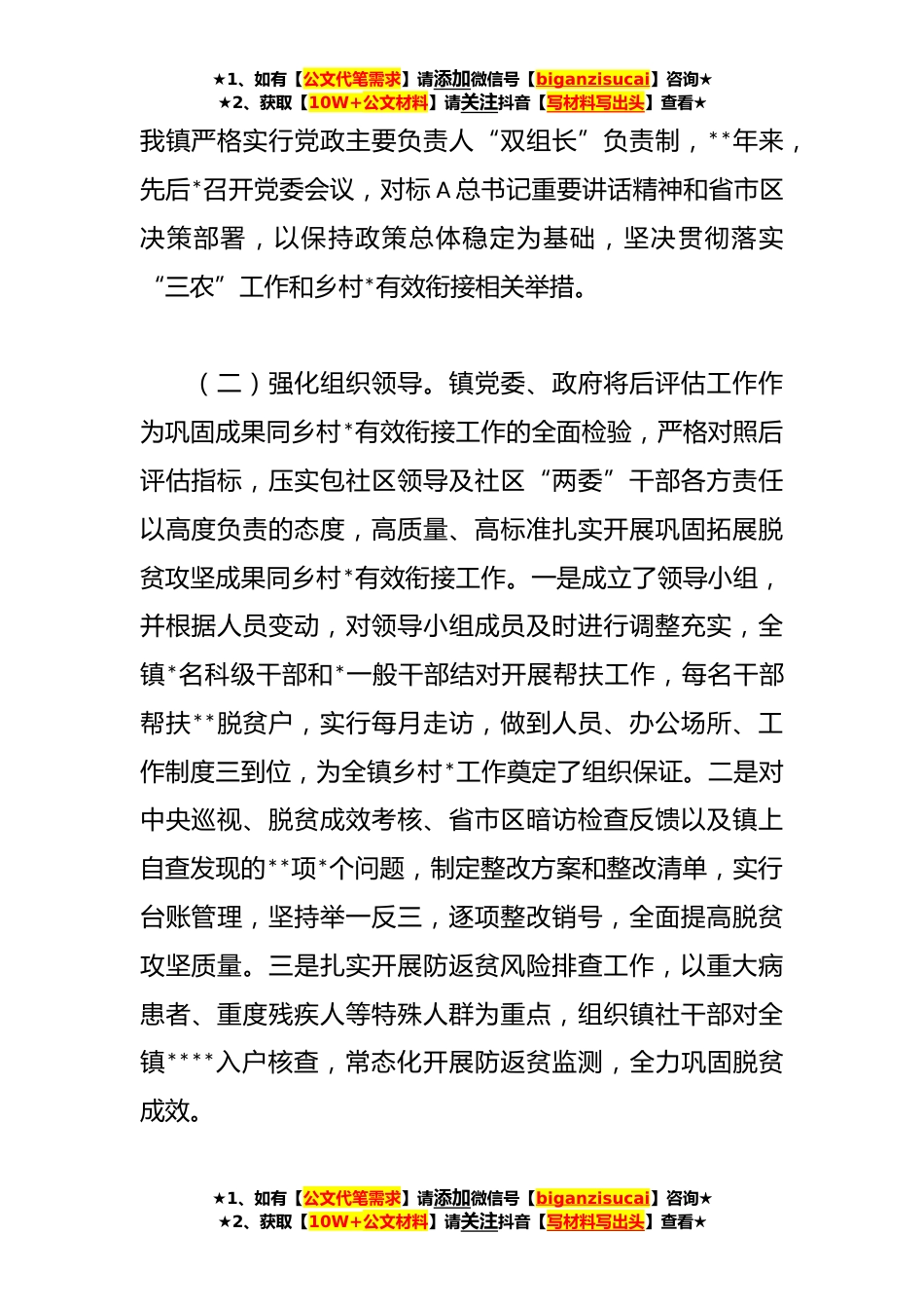 ★1、如有【公文代笔需求】请添加微信号【biganzisucai】咨询★★2、获取【10W+公文材料】请关注抖音【写材料写出头】查看★XX乡镇行乡村*工作第一责任人职责情况报告**年,镇党委*府主要负责人坚持深入学习贯彻A总书记关于“三农”工作重要论述和实施乡村*战略重要指示批示精神,按照省市区安排部署,坚持农业农村优先发展,按照产业兴旺、生态宜居、乡风文明、治理有效、生活*的总要求,大力实施乡村*战略,因地制宜、突出特色,以点带面、整体推进。一、工作开展情况(一)强化政治引领。我镇认真贯彻A总书记关于巩固拓展脱贫攻坚成果的重要指示精神,盯紧抓牢“四个不摘”,时刻保持攻坚态势,结合实际制定了《镇关于实现巩固拓展脱贫攻坚成果同乡村*有效衔接的实施方案》,对标区委“五看五比五促进”工作思...