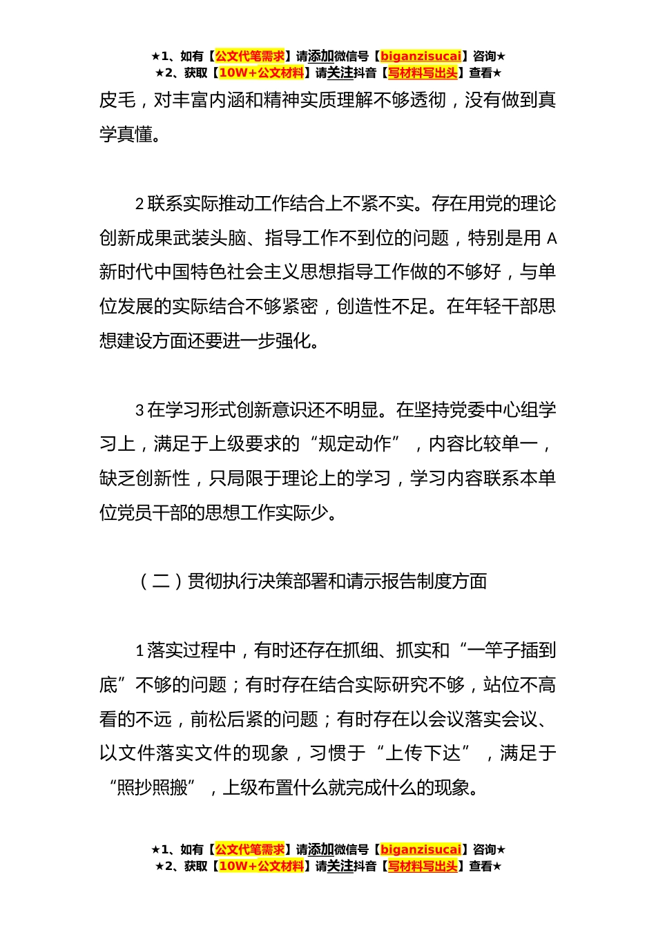 ★1、如有【公文代笔需求】请添加微信号【biganzisucai】咨询★★2、获取【10W+公文材料】请关注抖音【写材料写出头】查看★X党委领导班子民主生活会对照检查材料根据市纪委、市委组织部《关于开好全市县以*和国家机关党员领导干部民主生活会的通知》精神,在市委组织部民主生活会督导组的精心指导下,党委领导班子围绕民主生活会主题,对照初心和使命,广泛征求意见,严肃认真开展谈心谈话,开展党性分析,提出了改进作风、解决问题、提升能力的办法,并按要求充分做好了会前各项准备工作。现就领导班子问题情况对照检查如下:一、存在的问题及不足(一)学习贯彻新时代、新思想、新要求方面1理论学习不全面不系统不深入。有的对政治理论学习重要性的认识不深,存在实用主义,用什么学什么,与工作关系密切就学,...