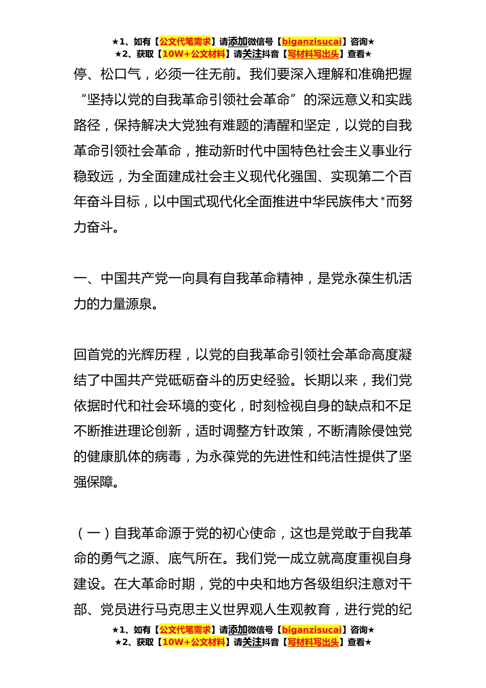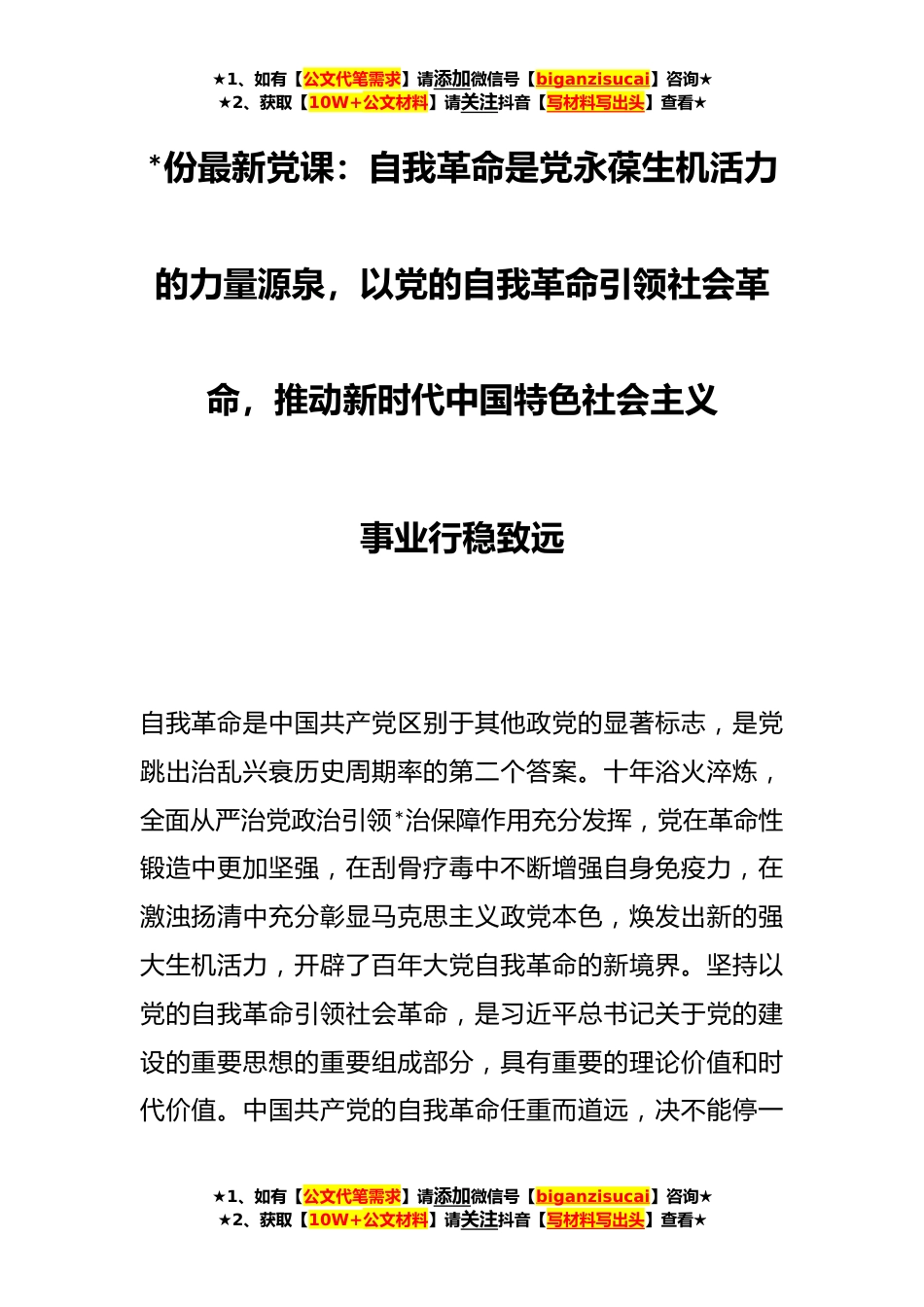 ★1、如有【公文代笔需求】请添加微信号【biganzisucai】咨询★★2、获取【10W+公文材料】请关注抖音【写材料写出头】查看★*份最新党课:自我革命是党永葆生机活力的力量源泉,以党的自我革命引领社会革命,推动新时代中国特色社会主义事业行稳致远自我革命是中国共产党区别于其他政党的显著标志,是党跳出治乱兴衰历史周期率的第二个答案。十年浴火淬炼,全面从严治党政治引领*治保障作用充分发挥,党在革命性锻造中更加坚强,在刮骨疗毒中不断增强自身免疫力,在激浊扬清中充分彰显马克思主义政党本色,焕发出新的强大生机活力,开辟了百年大党自我革命的新境界。坚持以党的自我革命引领社会革命,是习近平总书记关于党的建设的重要思想的重要组成部分,具有重要的理论价值和时代价值。中国共产党的自我革命任...