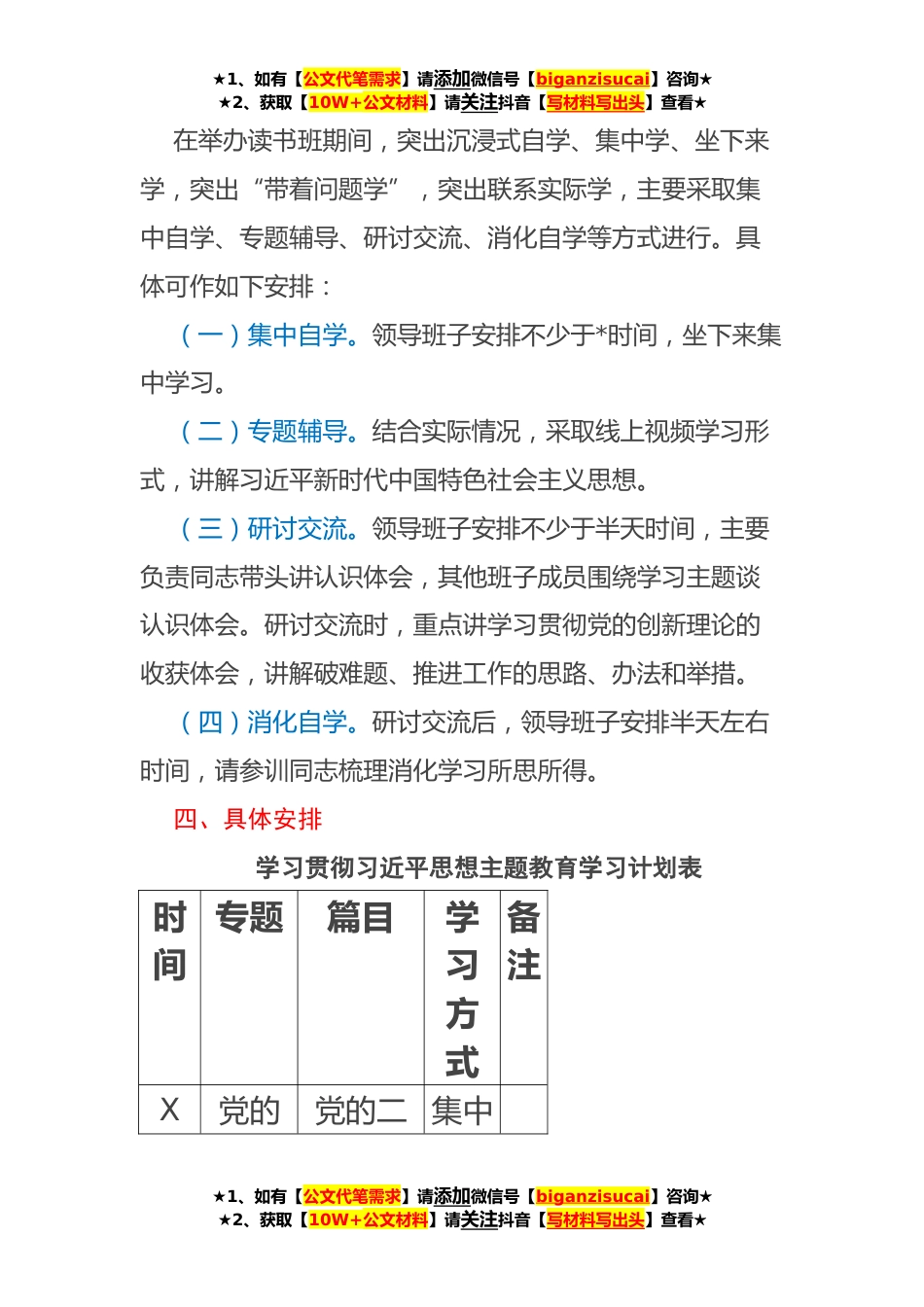 ★1、如有【公文代笔需求】请添加微信号【biganzisucai】咨询★★2、获取【10W+公文材料】请关注抖音【写材料写出头】查看★关于XX主题教育读书班学习计划安排根据《XX委员会关于印《XXX主题教育读书班工作方案》的通知》(X〔**〕X号)的通知要求,为严格落实XXX关于读书班相关文件要求,充分发挥领导干部示范带头作用,结合XXX实际,现制定如下计划。一、时间安排X月X日(周一)至X日(周五),公司领导班子读书班为期*。二、学习内容坚持读原著学原文悟原理,一篇一篇读、逐段逐句悟,重点学习*必读学习材料(党的XX大报告、党章、《习近平著作选读》《习近平新时代中国特色社会主义思想专题摘编》),通读精读*选读学习材料(《习近平新时代中国特色社会主义思想学习纲要》《论》),全面、系统、深入学习习近...